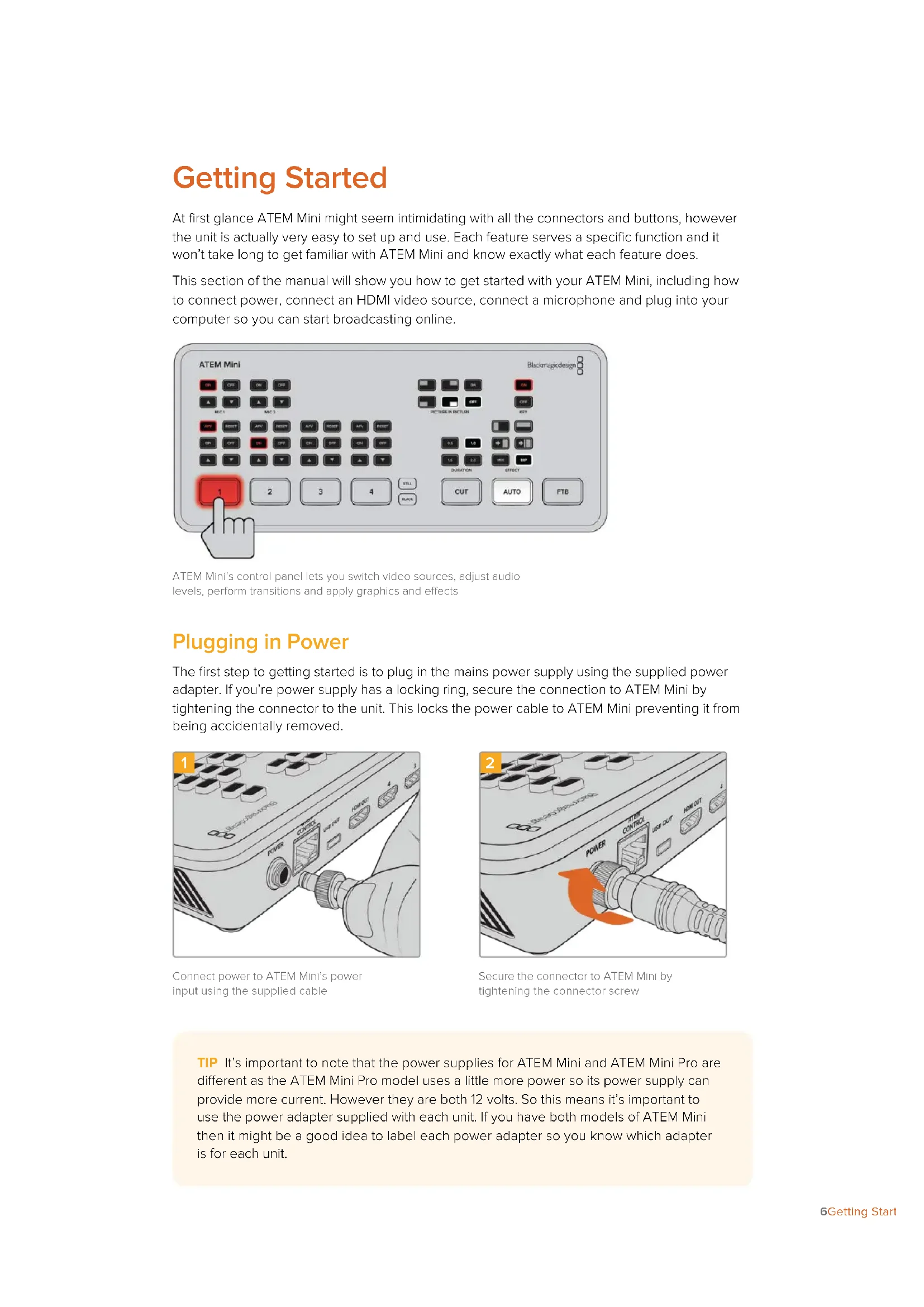 Connect power to ATEM Mini’s power input using the supplied cableSecure the connector to ATEM Mini by tightening the connector screw TIP It’s important to note that the power supplies for ATEM Mini and ATEM Mini Pro are different as the ATEM Mini Pro model uses a little more power so its power supply can provide more current. However they are both 12 volts. So this means it’s important to use the power adapter supplied with each unit. If you have both models of ATEM Mini then it might be a good idea to label each power adapter so you know which adapter is for each unit. 6Getting StartedPlugging in Video Sources Plug your HDMI cameras and other HDMI sources into ATEM Mini’s HDMI inputs. This gives you four different images to switch to when creating your program. Simply plug one end of the HDMI cable to your camera and the other end to any of ATEM Mini’s HDMI inputs. The first input you plug in will set the video format, so if the first video source you plug in is 1080p50, all other inputs will automatically be converted to 1080p50. If you want to set the video format yourself after plugging in all video sources, you can do that in the switcher settings in ATEM Software Control. You can find more information about changing the video format settings in the ‘using ATEM Software Control’ section. Plug HDMI sources into ATEM Mini’s four HDMI inputs Plugging in a Monitor and Testing Inputs With your video sources connected, you can now plug an HDMI television into ATEM Mini’s HDMI output and check all the inputs are working. This is also a good opportunity to check sources and see if your shots are smoothly switching between each other. To check your sources, simply press the numbered input buttons on ATEM Mini’s control panel and watch the HDMI television. If your sources are working correctly, you should see them switch between each other when you press the input buttons. Plug an HDMI television or monitor into ATEM Mini’s HDMI output so you can monitor your program output and check all your sources are working properly 7Getting StartedTIP ATEM Mini Pro has a powerful multiview feature that lets you see all your inputs, plus program and preview outputs simultaneously on one screen. The multiview is the default source for the HDMI output. This means once your ATEM Mini Pro is connected to an HDMI television you can see all your inputs at once and know they are all working straight away. Connect a Microphone When broadcasting a PowerPoint presentation or a kickstarter video, you might want to use a microphone so your voice can be heard loud and clear. Plug a microphone, for example a small wireless collar microphone, into one of the 3.5mm audio inputs. If you are broadcasting an interview, plug the second microphone into the second 3.5mm audio input. You can even plug a music player into one of the audio inputs and mix it into your production. Connect microphones to ATEM Mini’s mic inputs 8Getting StartedTIP While ATEM Mini will keep perfect audio and video synchronization, some cameras you connect might have some video processing delay. This can cause the audio on the ATEM Mini analog inputs to be slightly out of sync, because these inputs are not delayed like the camera’s video is. So you can select some audio delay on the analog audio inputs to keep all your audio and video sources in perfect sync. For more information, refer to the ‘delay control’ section in this manual. Connect your Computer Plug ATEM Mini’s webcam output into your computer’s USB input. Now your computer will recognize ATEM Mini as a webcam so you can select it as the webcam source in your streaming program, such as Skype or OBS Studio. Plug your computer into ATEM Mini’s webcam out USB-C connector TIP When recording to disk using ATEM Mini Pro, the USB connector will be busy recording to a disk so it won’t be free to use as a webcam output. However the ATEM Mini Pro model also has live streaming direct via its Ethernet connection. If you want to use the USB connection to record to a disk you can use the Ethernet connection for streaming. You can even use the Ethernet for external control using ATEM Software Control. Please refer to the ‘additional features on ATEM Mini Pro’ section for more information. Setting the Webcam Source In most cases, your streaming software will automatically set ATEM Mini as the webcam, so when you launch your streaming software you will see the picture from your ATEM Mini straight away. If your software doesn’t select ATEM Mini, simply set the software to use ATEM Mini as the webcam and microphone. Below is an example of how to set the webcam settings on Skype. 1 In Skype’s menu bar, open the ‘audio and video settings’. 2 Click on the ‘Camera’ drop down menu and select Blackmagic Design from the list. You will see the video from ATEM Mini appear in the preview window. 3 Now go to the ‘microphone’ drop down menu and select Blackmagic Design as your audio source. 9Getting StartedWith your Skype settings set correctly, perhaps try out a Skype call with a friend as a quick test to check your broadcast setup is working. That’s all you need to do and ATEM Mini is now ready to broadcast your video to the world live! Using Open Broadcaster Open Broadcaster is another streaming platform that takes your program video and streams it live via your favourite video sharing application, like YouTube or Vimeo. For information on how to set up Open Broadcaster with your ATEM Mini, refer to the ‘Setting up Open Broadcaster’ section in this manual. Transmitting Video with ATEM Streaming Bridge The ATEM Streaming Bridge allows you to decode the streaming video from any ATEM Mini Pro and convert it back to SDI or HDMI video. It allows you to send video over your local network, or to anywhere in the world via the internet. You can connect ATEM Streaming Bridge in 3 different ways. One is to connect it direct to your ATEM Mini Pro using a simple Ethern