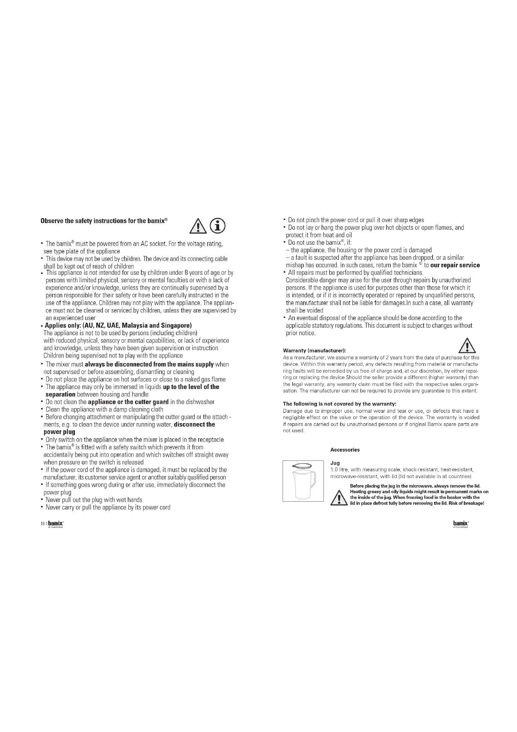 Please read all the information given in these instructions for use very carefully. It gives you important tips about the use, the safety and the care of the appliance. Keep these instructions in a safe place and pass them on to the next user. The appliance may only be used for the intended purpose according to these instructions for use.16 17 Observe the safety instructions for the bamix