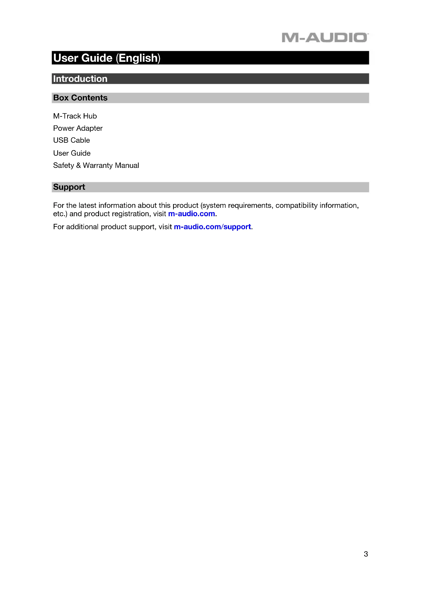 User Guide (English) Introduction Box Contents M-Track Hub Power Adapter USB Cable User Guide Safety & Warranty Manual Support For the latest information about this product (system requirements, compatibility information, etc.) and product registration, visit m-audio.com. For additional product support, visit m-audio.com/support.4 USB Flash Drive Power External MIDI Devices USB Flash Drive Monitors Computer Power Quick Start Windows users: Before connecting M-Track Hub to your computer, install the drivers: