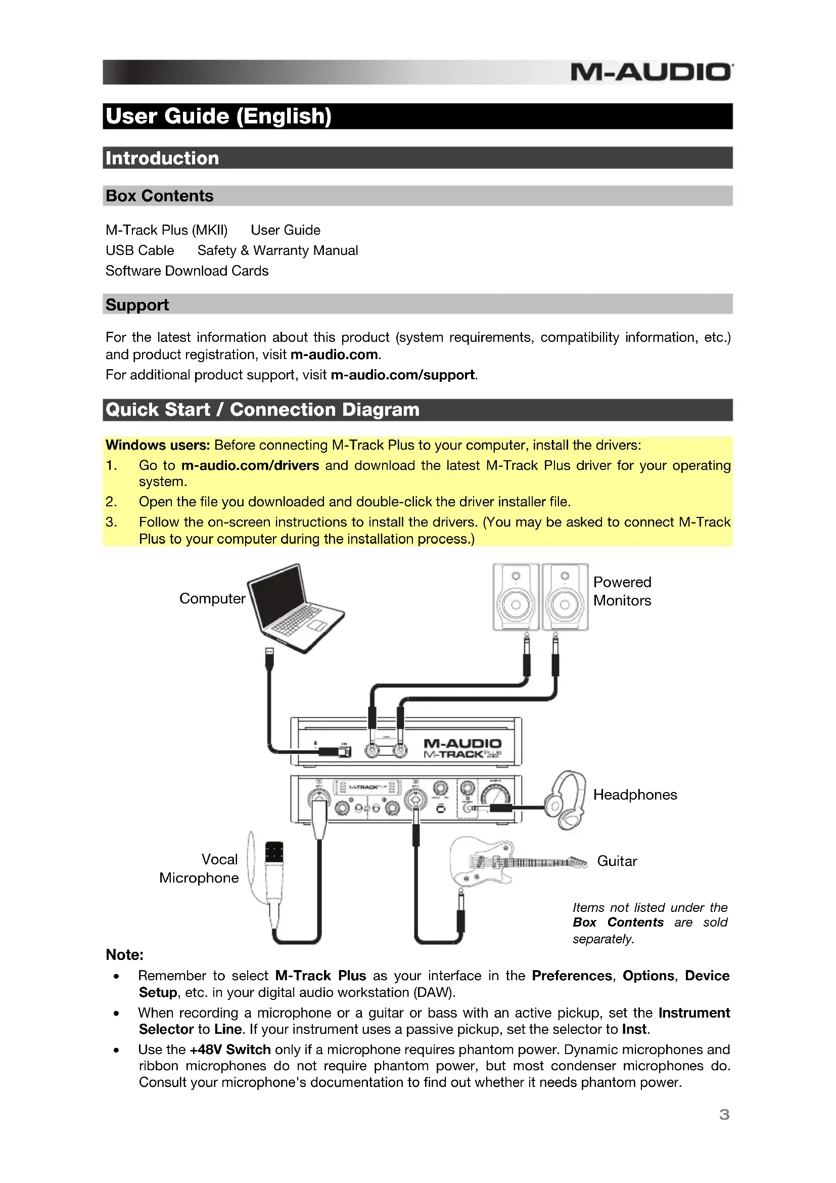 User Guide (English) Introduction Box Contents M-Track Plus (MKII) User Guide USB Cable Safety & Warranty Manual Software Download Cards Support For the latest information about this product (system requirements, compatibility information, etc.) and product registration, visit m-audio.com. For additional product support, visit m-audio.com/support. Quick Start / Connection Diagram Windows users: Before connecting M-Track Plus to your computer, install the drivers: