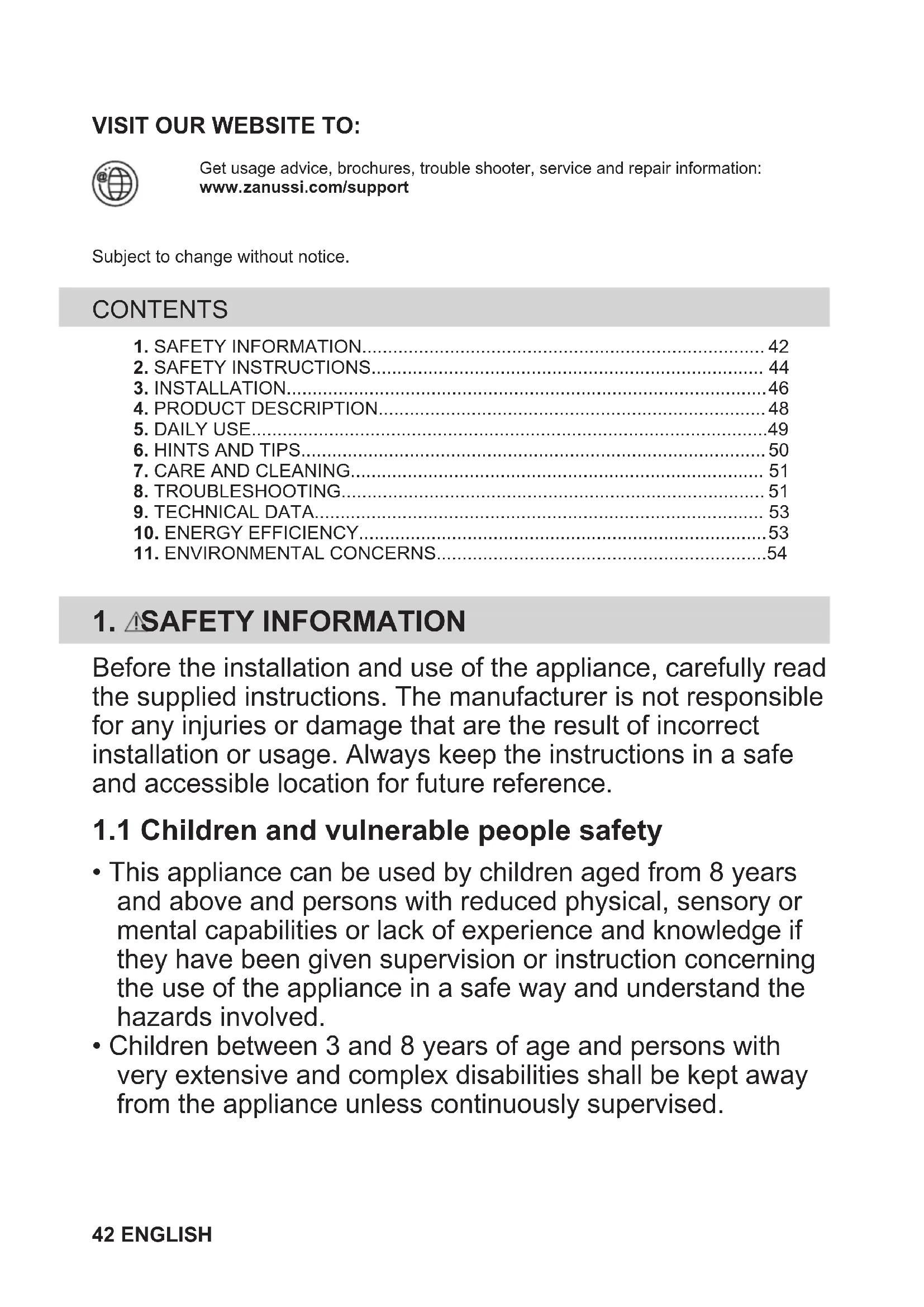 - Children between 3 and 8 years of age and persons with very extensive and complex disabilities shall be kept away from the appliance unless continuously supervised. 42 ENGLISH• Children of less than 3 years of age should be kept away from the appliance unless continuously supervised.