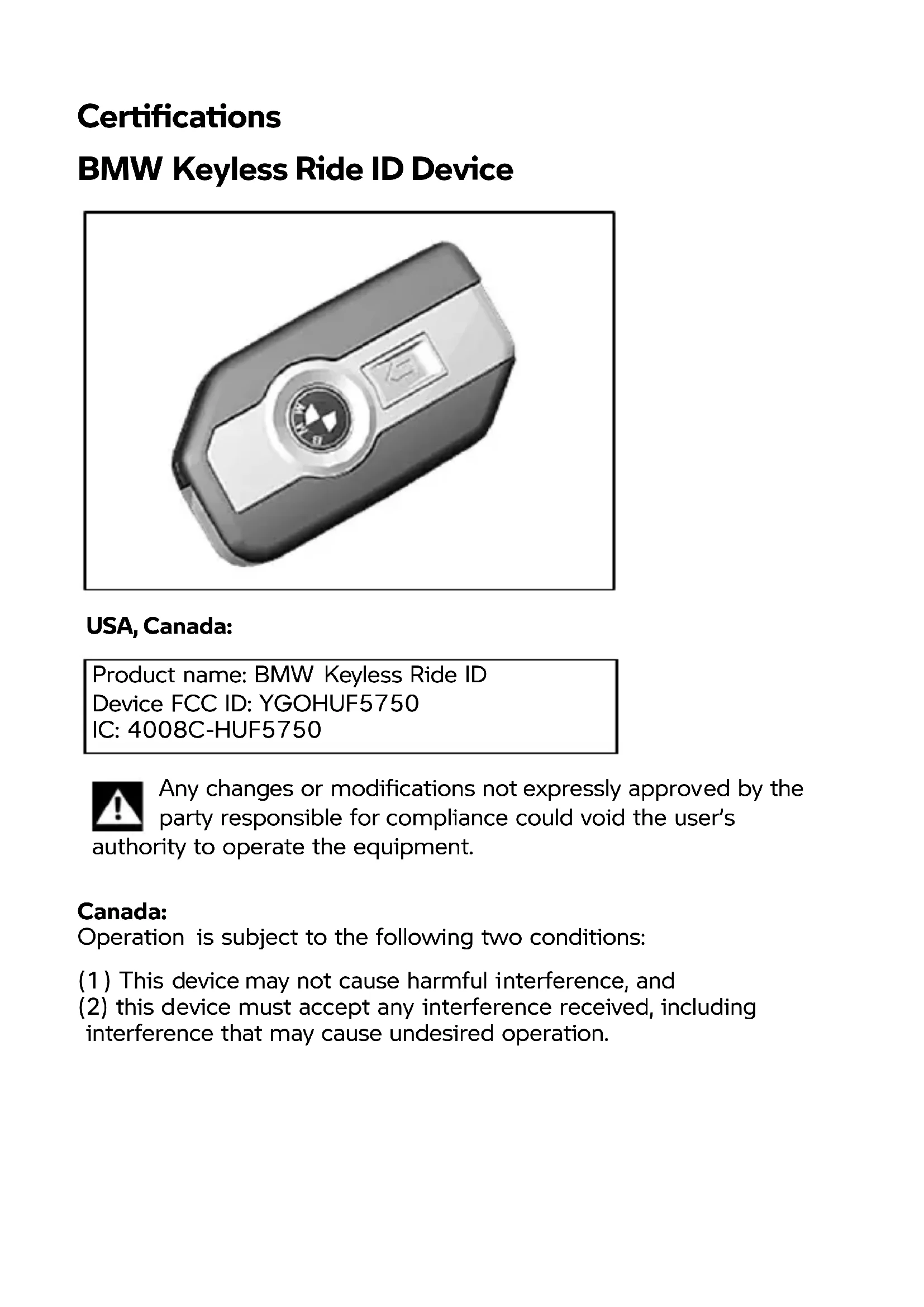 declare under our responsibility that the product BMW Keyless Ride ID Device (Model: HUF5750) camplies with the appropriate essential requirements of the article 3 of the R&TIE and the other relevant provisions, when used for its intended purpose. Applied Standards: