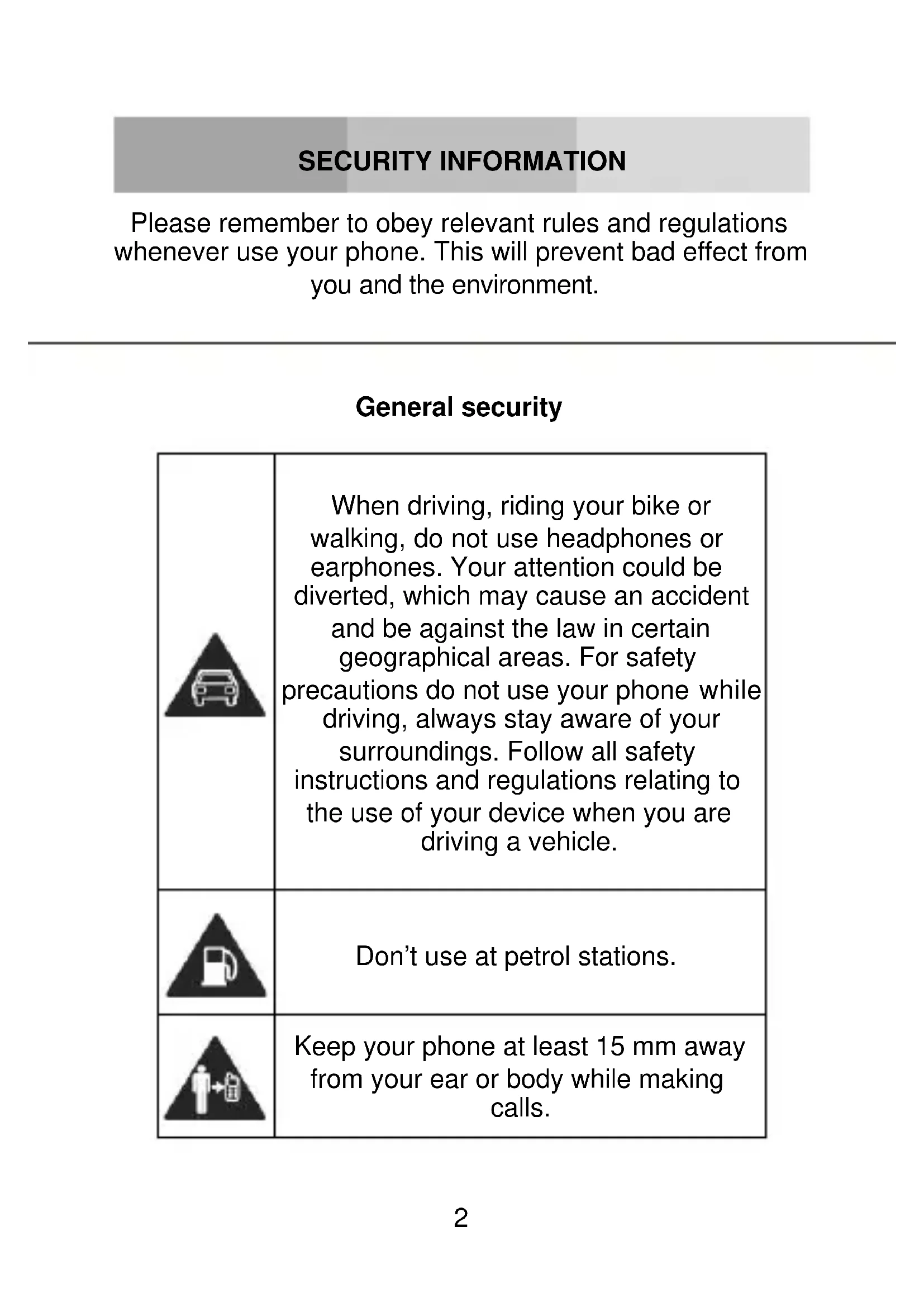 SECURITY INFORMATION Please remember to obey relevant rules and regulations whenever use your phone. This will prevent bad effect from you and the environment.