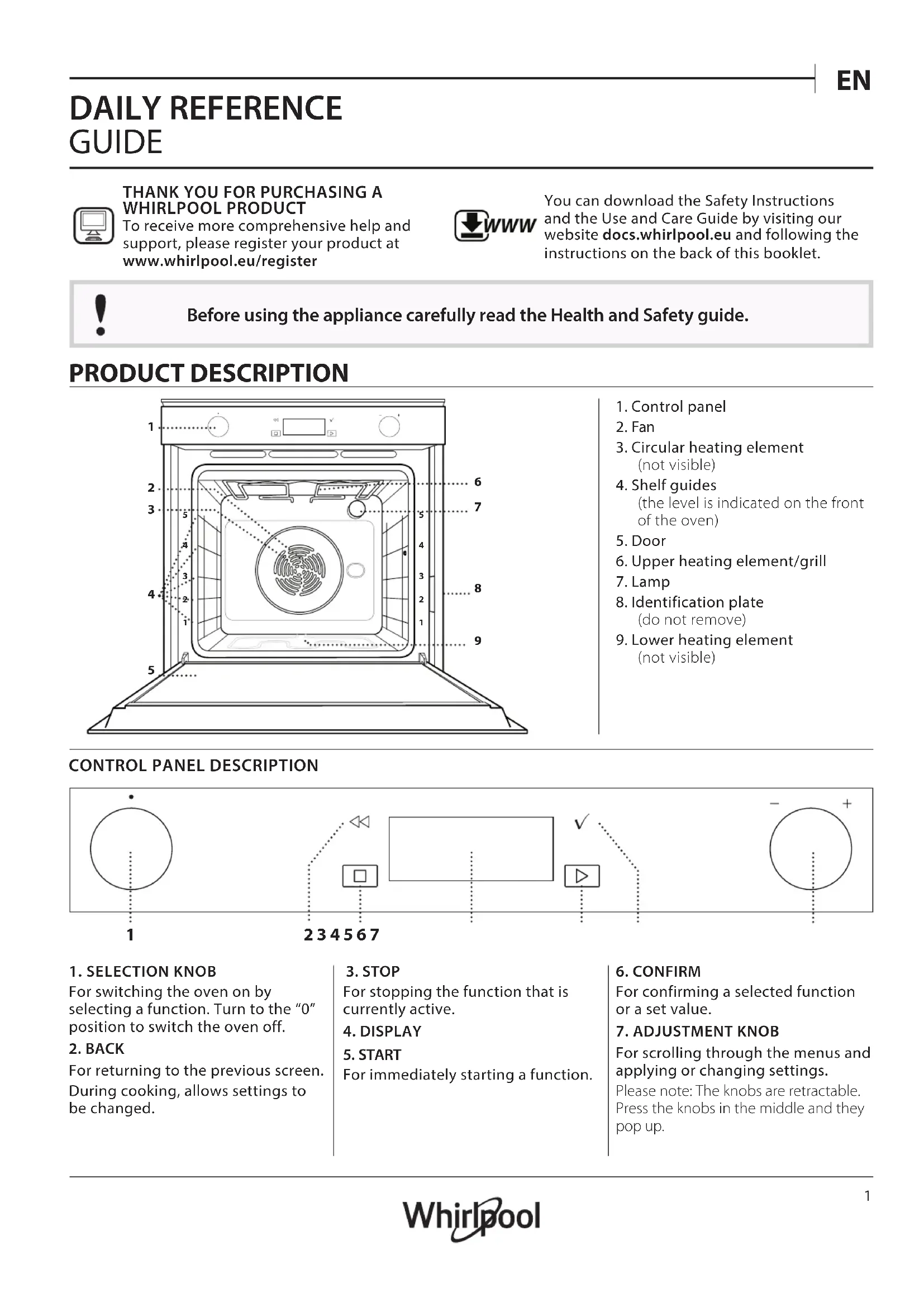 DAILY REFERENCE GUIDE THANK YOU FOR PURCHASING A WHIRLPOOL PRODUCTTo receive more comprehensive help and support, please register your product at www . whirlpool . eu/ register WWW You can download the Safety Instructions and the Use and Care Guide by visiting our website docs . whirlpool . eu and following the instructions on the back of this booklet. Before using the appliance carefully read the Health and Safety guide. PRODUCT DESCRIPTION 1. Control panel2. Fan3. Circular heating element(not visible)4. Shelf guides(the level is indicated on the frontof the oven)5. Door6. Upper heating element/grill7. Lamp8. Identification plate(do not remove)9. Lower heating element(not visible)CONTROL PANEL DESCRIPTION 2 3 4 5 6 71. SELECTION KNOBFor switching the oven on byselecting a function. Turn to the “0” position to switch the oven off.2. BACKFor returning to the previous screen.During cooking, allows settings tobe changed.3. STOPFor stopping the function that iscurrently active.4. DISPLAY5. STARTFor immediately starting a function.6. CONFIRMFor confirming a selected functionor a set value.7. ADJUSTMENT KNOBFor scrolling through the menus andapplying or changing settings.Please note: The knobs are retractable.Press the knobs in the middle and theypop up.