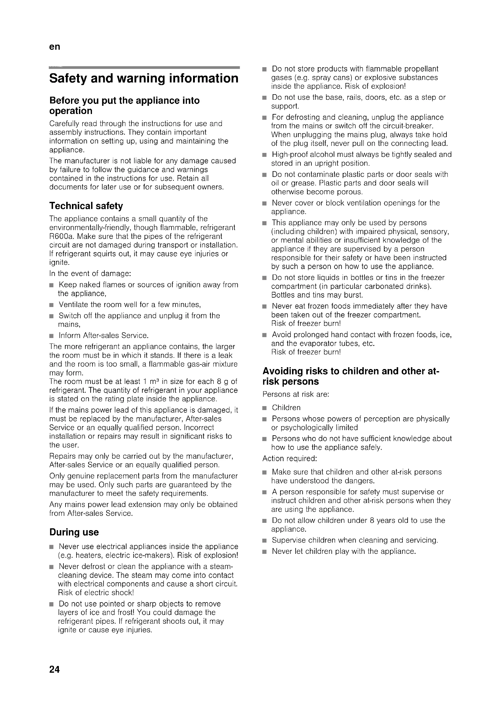 enTable of contents enInstructions for use Safety and warning information Before you put the appliance into operation Carefully read through the instructions for use and assembly instructions. They contain important information on setting up, using and maintaining the appliance. The manufacturer is not liable for any damage caused by failure to follow the guidance and warnings contained in the instructions for use. Retain all documents for later use or for subsequent owners. Technical safety The appliance contains a small quantity of the environmentally-friendly, though flammable, refrigerant R600a. Make sure that the pipes of the refrigerant circuit are not damaged during transport or installation. If refrigerant squirts out, it may cause eye injuries or ignite. In the event of damage: ■ Keep naked flames or sources of ignition away from the appliance, ■ Ventilate the room well for a few minutes, ■ Switch off the appliance and unplug it from the mains, ■ Inform After-sales Service. The more refrigerant an appliance contains, the larger the room must be in which it stands. If there is a leak and the room is too small, a flammable gas-air mixture may form. The room must be at least 1 m³ in size for each 8 g of refrigerant. The quantity of refrigerant in your appliance is stated on the rating plate inside the appliance. If the mains power lead of this appliance is damaged, it must be replaced by the manufacturer, After-sales Service or an equally qualified person. Incorrect installation or repairs may result in significant risks to the user. Repairs may only be carried out by the manufacturer, After-sales Service or an equally qualified person. Only genuine replacement parts from the manufacturer may be used. Only such parts are guaranteed by the manufacturer to meet the safety requirements. Any mains power lead extension may only be obtained from After-sales Service. During use ■ Never use electrical appliances inside the appliance (e.g. heaters, electric ice-makers). Risk of explosion! ■ Never defrost or clean the appliance with a steam- cleaning device. The steam may come into contact with electrical components and cause a short circuit. Risk of electric shock! ■ Do not use pointed or sharp objects to remove layers of ice and frost! You could damage the refrigerant pipes. If refrigerant shoots out, it may ignite or cause eye injuries. ■ Do not store products with flammable propellant gases (e.g. spray cans) or explosive substances inside the appliance. Risk of explosion! ■ Do not use the base, rails, doors, etc. as a step or support. ■ For defrosting and cleaning, unplug the appliance from the mains or switch off the circuit-breaker. When unplugging the mains plug, always take hold of the plug itself, never pull on the connecting lead. ■ High-proof alcohol must always be tightly sealed and stored in an upright position. ■ Do not contaminate plastic parts or door seals with oil or grease. Plastic parts and door seals will otherwise become porous. ■ Never cover or block ventilation openings for the appliance. ■ This appliance may only be used by persons (including children) with impaired physical, sensory, or mental abilities or insufficient knowledge of the appliance if they are supervised by a person responsible for their safety or have been instructed by such a person on how to use the appliance. ■ Do not store liquids in bottles or tins in the freezer compartment (in particular carbonated drinks). Bottles and tins may burst. ■ Never eat frozen foods immediately after they have been taken out of the freezer compartment. Risk of freezer burn! ■ Avoid prolonged hand contact with frozen foods, ice, and the evaporator tubes, etc. Risk of freezer burn! Avoiding risks to children and other at- risk persons Persons at risk are: ■ Children ■ Persons whose powers of perception are physically or psychologically limited ■ Persons who do not have sufficient knowledge about how to use the appliance safely. Action required: ■ Make sure that children and other at-risk persons have understood the dangers. ■ A person responsible for safety must supervise or instruct children and other at-risk persons when they are using the appliance. ■ Do not allow children under 8 years old to use the appliance. ■ Supervise children when cleaning and servicing. ■ Never let children play with the appliance.en