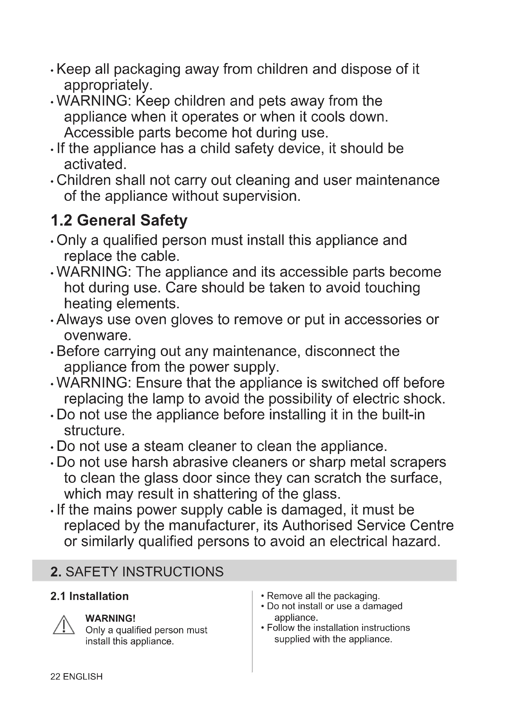 - Follow the installation instructions supplied with the appliance. 22 ENGLISH• Always take care when moving the appliance as it is heavy. Always use safety gloves and enclosed footwear.