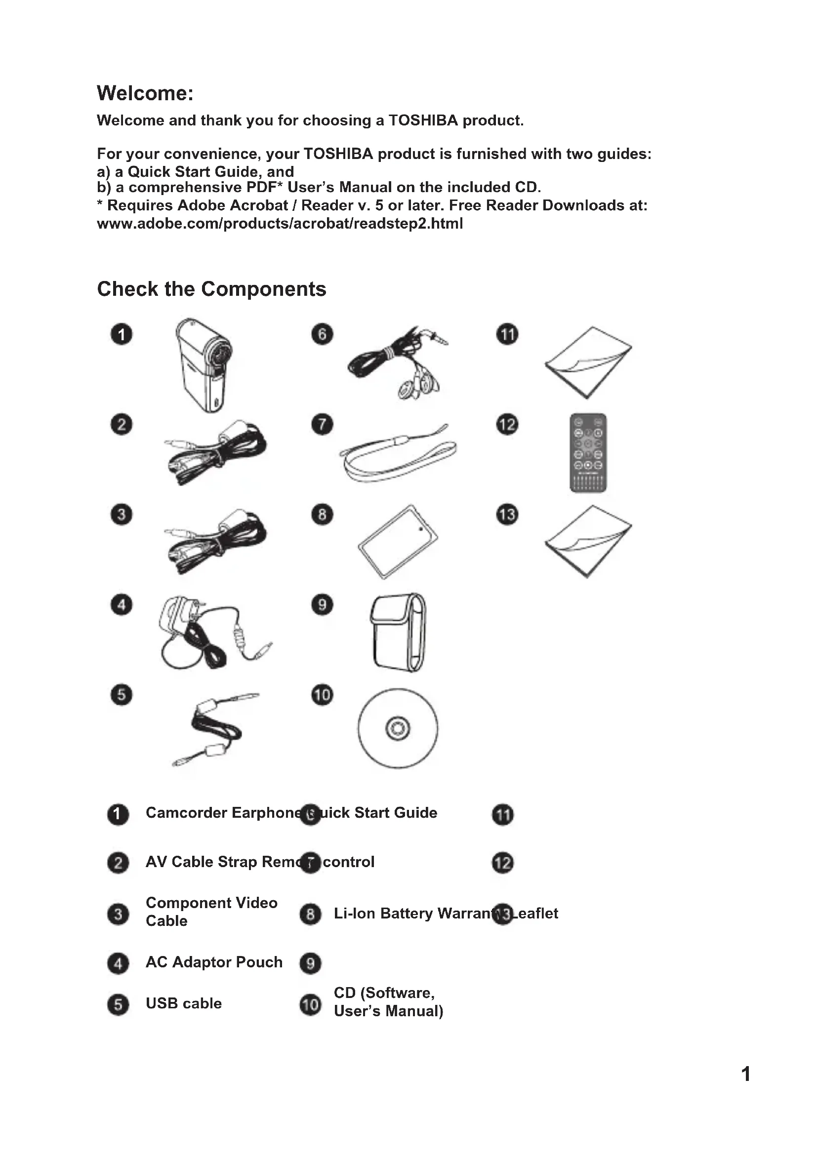 IT1 Welcome: Welcome and thank you for choosing a TOSHIBA product. For your convenience, your TOSHIBA product is furnished with two guides: a) a Quick Start Guide, and b) a comprehensive PDF* User’s Manual on the included CD.
