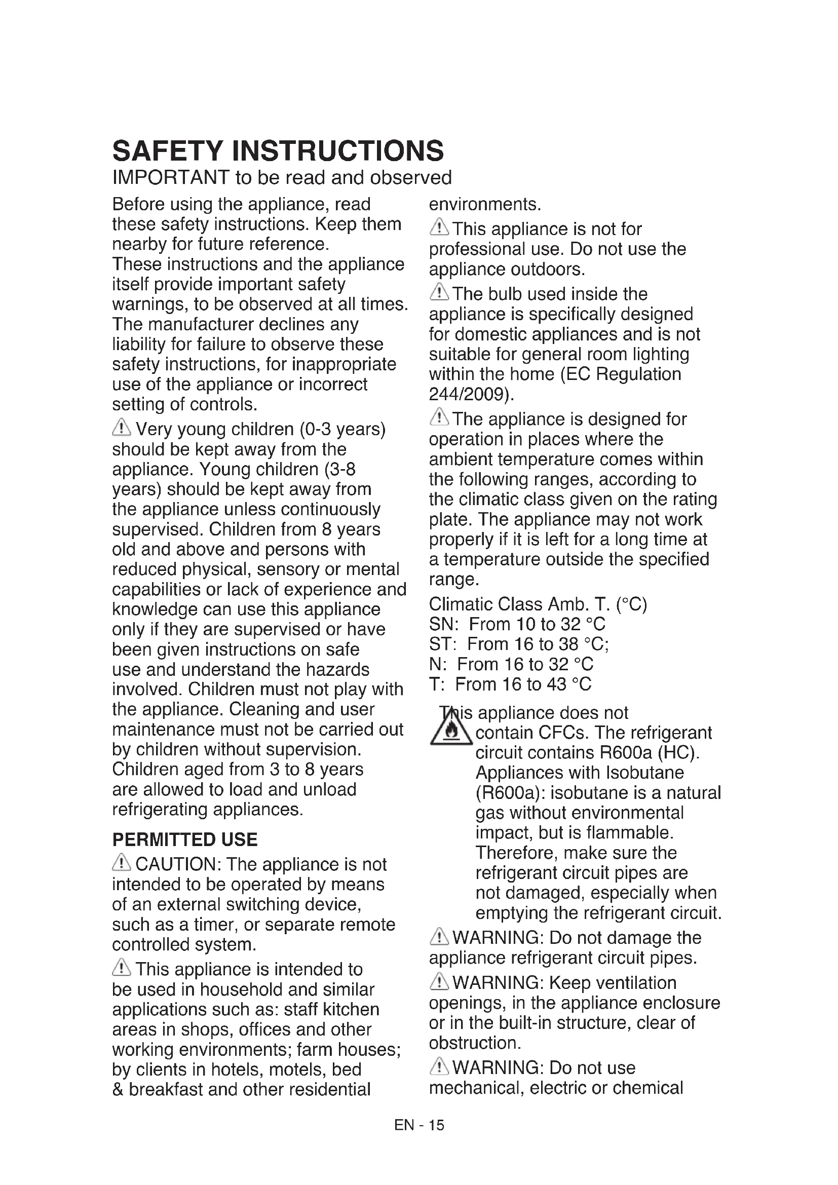 Diese Darstellung dient nur zur Information über die Geräteteile. Die Teile können je nach Gerätemodell unterschiedlich sein.EN - 15 SAFETY INSTRUCTIONS IMPORTANT to be read and observed Before using the appliance, read these safety instructions. Keep them nearby for future reference. These instructions and the appliance itself provide important safety warnings, to be observed at all times. The manufacturer declines any liability for failure to observe these safety instructions, for inappropriate use of the appliance or incorrect setting of controls. Very young children (0-3 years) should be kept away from the appliance. Young children (3-8 years) should be kept away from the appliance unless continuously supervised. Children from 8 years old and above and persons with reduced physical, sensory or mental capabilities or lack of experience and knowledge can use this appliance only if they are supervised or have been given instructions on safe use and understand the hazards involved. Children must not play with the appliance. Cleaning and user maintenance must not be carried out by children without supervision. Children aged from 3 to 8 years are allowed to load and unload refrigerating appliances. PERMITTED USE CAUTION: The appliance is not intended to be operated by means of an external switching device, such as a timer, or separate remote controlled system. This appliance is intended to be used in household and similar applications such as: staff kitchen areas in shops, ofces and other working environments; farm houses; by clients in hotels, motels, bed & breakfast and other residential environments. This appliance is not for professional use. Do not use the appliance outdoors. The bulb used inside the appliance is specically designed for domestic appliances and is not suitable for general room lighting within the home (EC Regulation 244/2009). The appliance is designed for operation in places where the ambient temperature comes within the following ranges, according to the climatic class given on the rating plate. The appliance may not work properly if it is left for a long time at a temperature outside the specied range. Climatic Class Amb. T. (°C) SN: From 10 to 32 °C ST: From 16 to 38 °C; N: From 16 to 32 °C T: From 16 to 43 °C This appliance does not contain CFCs. The refrigerant circuit contains R600a (HC). Appliances with Isobutane (R600a): isobutane is a natural gas without environmental impact, but is ammable. Therefore, make sure the refrigerant circuit pipes are not damaged, especially when emptying the refrigerant circuit.