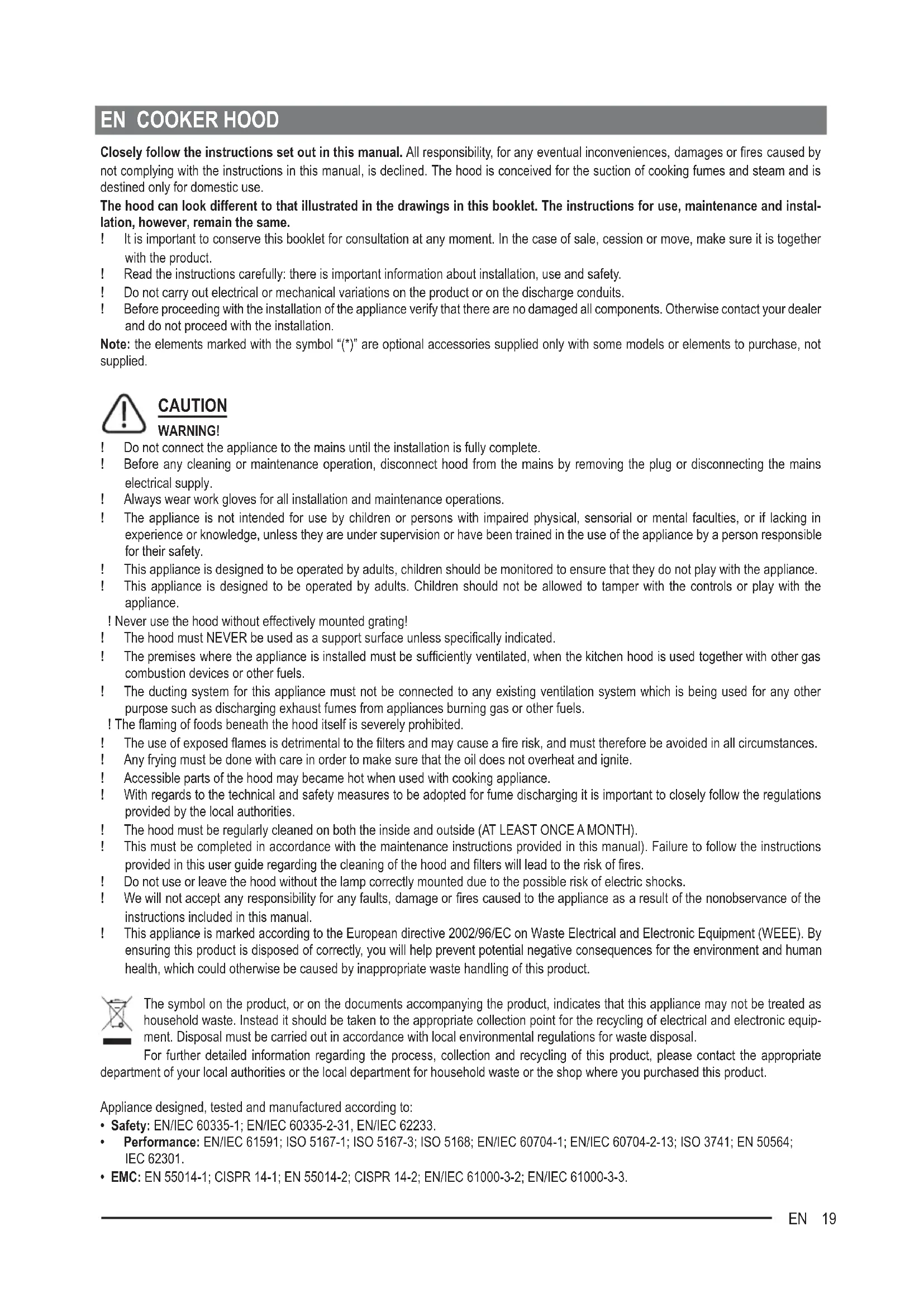Closely follow the instructions set out in this manual. All responsibility, for any eventual inconveniences, damages or res caused by not complying with the instructions in this manual, is declined. The hood is conceived for the suction of cooking fumes and steam and is destined only for domestic use. The hood can look different to that illustrated in the drawings in this booklet. The instructions for use, maintenance and instal- lation, however, remain the same. ! It is important to conserve this booklet for consultation at any moment. In the case of sale, cession or move, make sure it is together with the product. ! Read the instructions carefully: there is important information about installation, use and safety. ! Do not carry out electrical or mechanical variations on the product or on the discharge conduits. ! Before proceeding with the installation of the appliance verify that there are no damaged all components. Otherwise contact your dealer and do not proceed with the installation. Note: the elements marked with the symbol “(*)” are optional accessories supplied only with some models or elements to purchase, not supplied. CAUTION WARNING! ! Do not connect the appliance to the mains until the installation is fully complete. ! Before any cleaning or maintenance operation, disconnect hood from the mains by removing the plug or disconnecting the mains electrical supply. ! Always wear work gloves for all installation and maintenance operations. ! The appliance is not intended for use by children or persons with impaired physical, sensorial or mental faculties, or if lacking in experience or knowledge, unless they are under supervision or have been trained in the use of the appliance by a person responsible for their safety. ! This appliance is designed to be operated by adults, children should be monitored to ensure that they do not play with the appliance. ! This appliance is designed to be operated by adults. Children should not be allowed to tamper with the controls or play with the appliance. ! Never use the hood without effectively mounted grating! ! The hood must NEVER be used as a support surface unless specically indicated. ! The premises where the appliance is installed must be sufciently ventilated, when the kitchen hood is used together with other gas combustion devices or other fuels. ! The ducting system for this appliance must not be connected to any existing ventilation system which is being used for any other purpose such as discharging exhaust fumes from appliances burning gas or other fuels. ! The aming of foods beneath the hood itself is severely prohibited. ! The use of exposed ames is detrimental to the lters and may cause a re risk, and must therefore be avoided in all circumstances. ! Any frying must be done with care in order to make sure that the oil does not overheat and ignite. ! Accessible parts of the hood may became hot when used with cooking appliance. ! With regards to the technical and safety measures to be adopted for fume discharging it is important to closely follow the regulations provided by the local authorities. ! The hood must be regularly cleaned on both the inside and outside (AT LEAST ONCE A MONTH). ! This must be completed in accordance with the maintenance instructions provided in this manual). Failure to follow the instructions provided in this user guide regarding the cleaning of the hood and lters will lead to the risk of res. ! Do not use or leave the hood without the lamp correctly mounted due to the possible risk of electric shocks. ! We will not accept any responsibility for any faults, damage or res caused to the appliance as a result of the nonobservance of the instructions included in this manual. ! This appliance is marked according to the European directive 2002/96/EC on Waste Electrical and Electronic Equipment (WEEE). By ensuring this product is disposed of correctly, you will help prevent potential negative consequences for the environment and human health, which could otherwise be caused by inappropriate waste handling of this product. The symbol on the product, or on the documents accompanying the product, indicates that this appliance may not be treated as household waste. Instead it should be taken to the appropriate collection point for the recycling of electrical and electronic equip- ment. Disposal must be carried out in accordance with local environmental regulations for waste disposal. For further detailed information regarding the process, collection and recycling of this product, please contact the appropriate department of your local authorities or the local department for household waste or the shop where you purchased this product. Appliance designed, tested and manufactured according to: