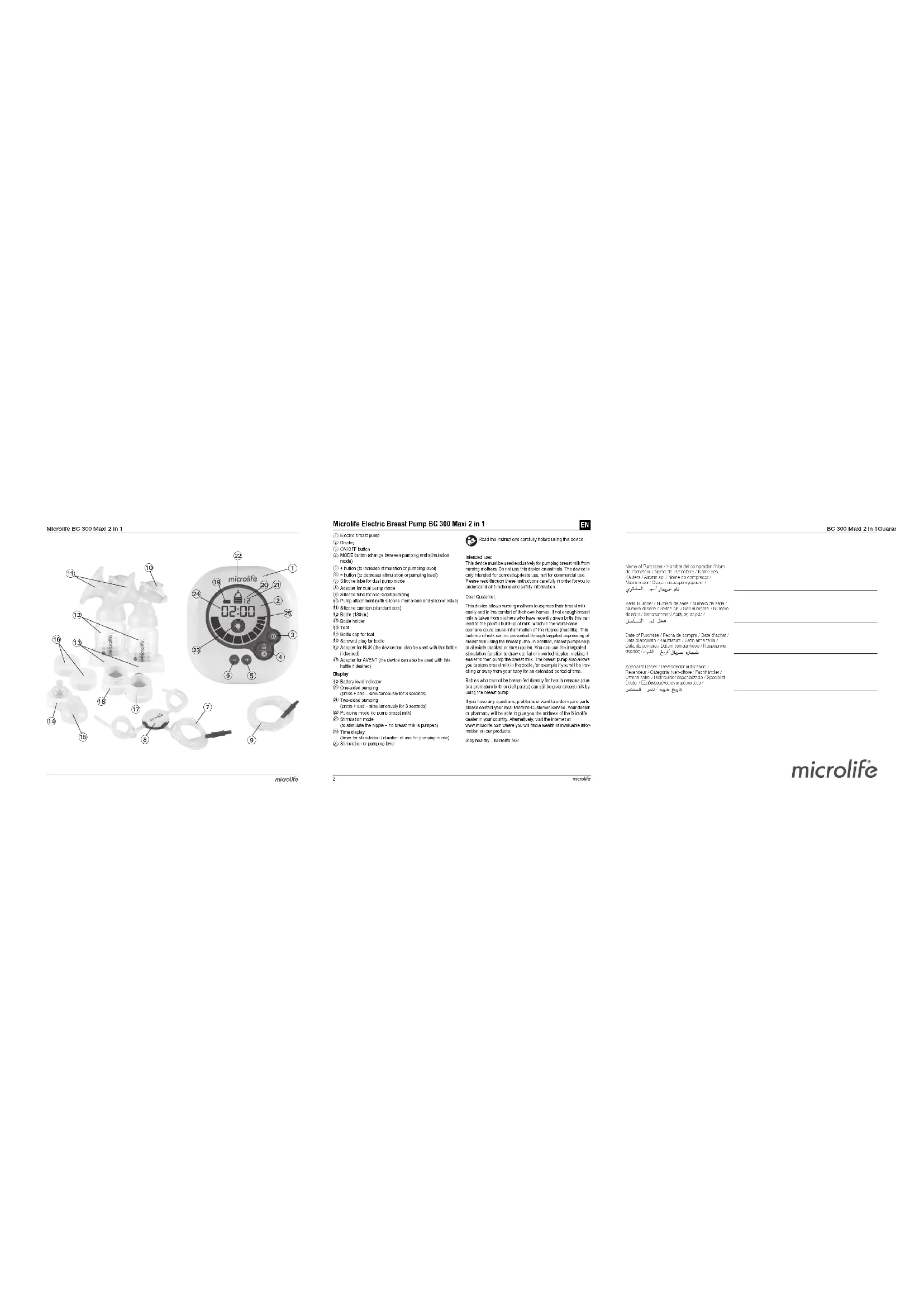 Read the instructions carefully before using this device. Intended use: This device must be used exclusively for pumping breast milk from nursing mothers. Do not use this device on animals. The device is only intended for domestic/private use, not for commercial use. Please read through these instructions carefully in order for you to understand all functions and safety information. Dear Customer, This device allows nursing mothers to express their breast milk easily and in the comfort of their own homes. If not enough breast milk is taken from mothers who have recently given birth, this can lead to the painful build-up of milk, which in the worst-case scenario could cause inflammation of the nipples (mastitis). This build-up of milk can be prevented through targeted expressing of breast milk using the breast pump. In addition, breast pumps help to alleviate cracked or sore nipples. You can use the integrated stimulation function to draw out flat or inverted nipples, making it easier to then pump the breast milk. The breast pump also allows you to store breast milk in the bottle, for example if you will be trav- elling or away from your baby for an extended period of time. Babies who cannot be breast-fed directly for health reasons (due to a premature birth or cleft palate) can still be given breast milk by using the breast pump. If you have any questions, problems or want to order spare parts please contact your local Microlife-Customer Service. Your dealer or pharmacy will be able to give you the address of the Microlife dealer in your country. Alternatively, visit the internet at www.microlife.com where you will find a wealth of invaluable infor- mation on our products. Stay healthy – Microlife AG! Microlife Electric Breast Pump BC 300 Maxi 2 in 1