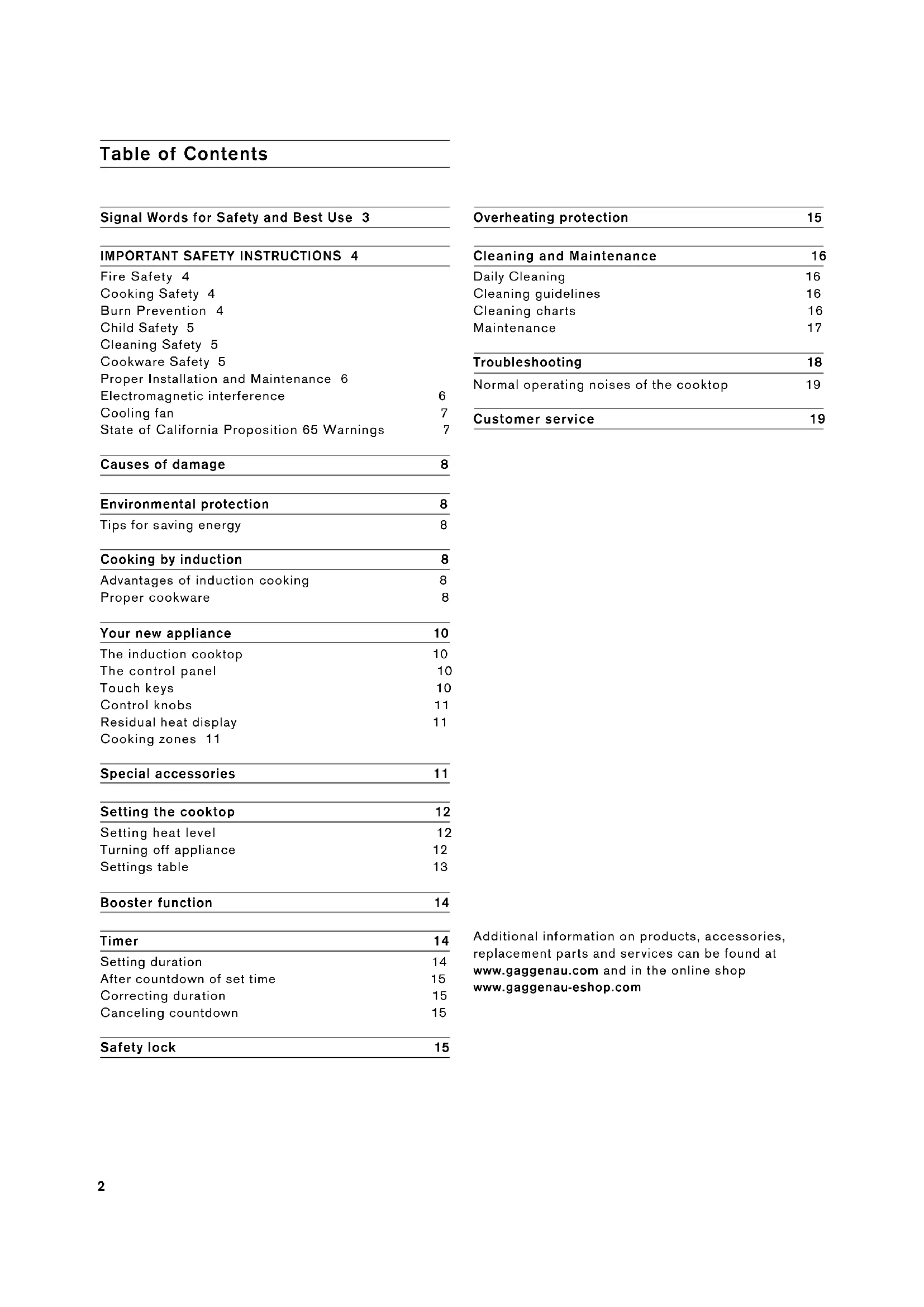 Fire Safety 4 Cooking Safety 4 Burn Prevention 4 Child Safety 5 Cleaning Safety 5 Cookware Safety 5 Proper Installation and Maintenance 6 Electromagnetic interference 6 Cooling fan 7 State of California Proposition 65 Warnings 7 Causes of damage 8 Environmental protection 8 Tips for saving energy 8 Cooking by induction 8 Advantages of induction cooking 8 Proper cookware 8 Your new appliance 10 The induction cooktop 10 The control panel 10 Touch keys 10 Control knobs 11 Residual heat display 11 Cooking zones 11 Special accessories 11 Setting the cooktop 12 Setting heat level 12 Turning off appliance 12 Settings table 13 Booster function 14 Timer 14 Setting duration 14 After countdown of set time 15 Correcting duration 15 Canceling countdown 15 Safety lock 15 Overheating protection 15 Cleaning and Maintenance 16 Daily Cleaning 16 Cleaning guidelines 16 Cleaning charts 16 Maintenance 17 Troubleshooting 18 Normal operating noises of the cooktop 19 Customer service 19 Additional information on products, accessories, replacement parts and services can be found at www.gaggenau.com and in the online shop www.gaggenau-eshop.com3 Signal Words for Safety and Best Use 9 WARNING This indicates that death or serious injuries may occur as a result of non-observance of this warning. 9 CAUTION This indicates that minor or moderate injuries may occur as a result of non-observance of this warning. NOTICE: This indicates that damage to the appliance or property may occur as a result of non-compliance with this advisory. Note: This alerts you to important information and/or tips.4