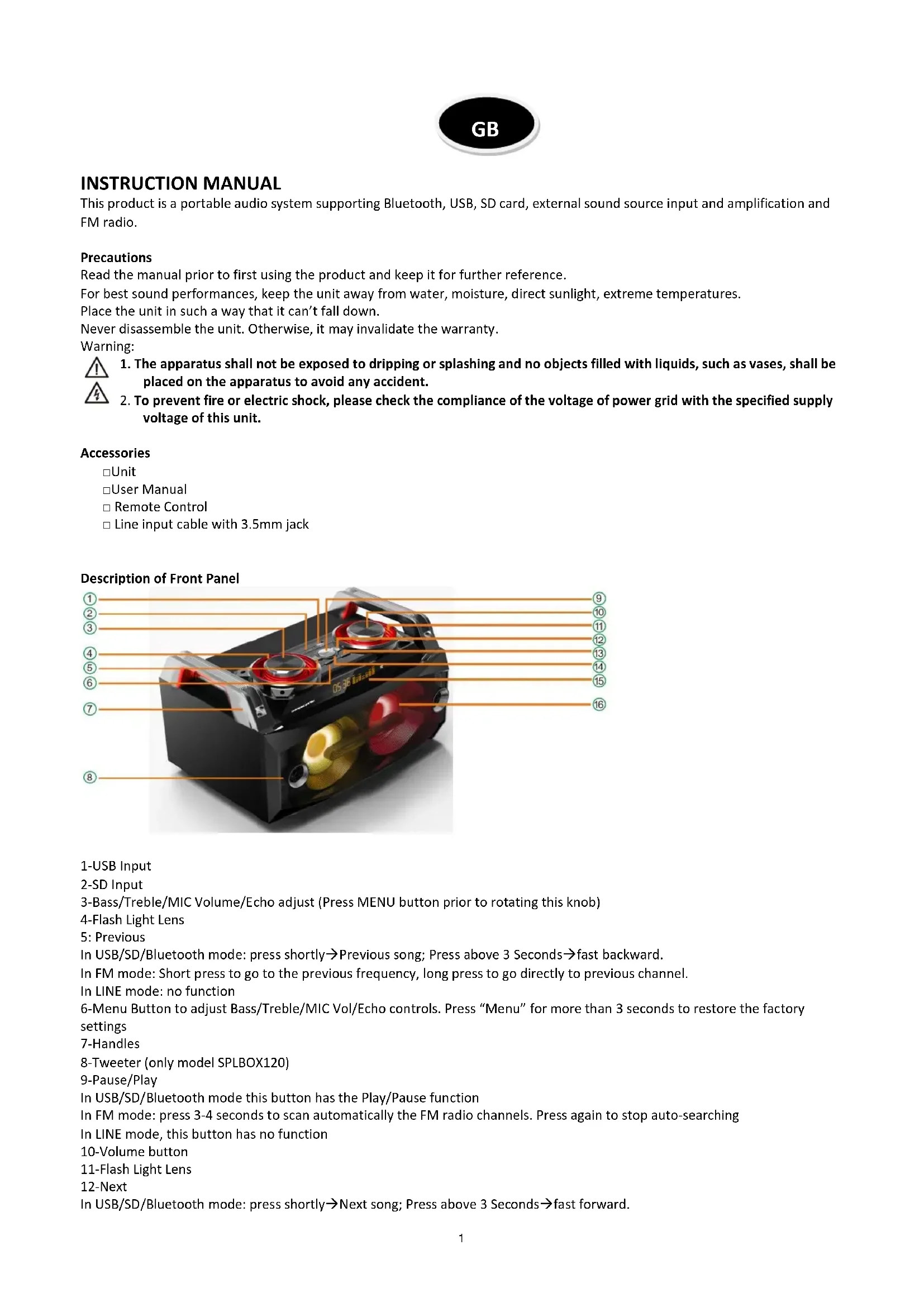 INSTRUCTION MANUAL This product is a portable audio system supporting Bluetooth, USB, SD card, external sound source input and amplification and FM radio. Precautions Read the manual prior to first using the product and keep it for further reference. For best sound performances, keep the unit away from water, moisture, direct sunlight, extreme temperatures. Place the unit in such a way that it can’t fall down. Never disassemble the unit. Otherwise, it may invalidate the warranty.