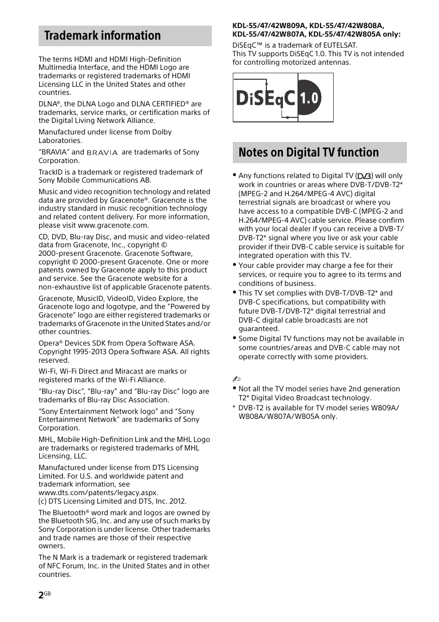 Trademark information The terms HDMI and HDMI High-Definition Multimedia Interface, and the HDMI Logo are trademarks or registered trademarks of HDMI Licensing LLC in the United States and other countries. KDL-55/47/42W809A, KDL-55/47/42W808A, KDL-55/47/42W807A, KDL-55/47/42W805A only: DiSEqC™ is a trademark of EUTELSAT. This TV supports DiSEqC 1.0. This TV is not intended for controlling motorized antennas. DLNA®, the DLNA Logo and DLNA CERTIFIED® are trademarks, service marks, or certification marks of the Digital Living Network Alliance. Manufactured under license from Dolby Laboratories. “BRAVIA” and Corporation. are trademarks of Sony TrackID is a trademark or registered trademark of Sony Mobile Communications AB. Music and video recognition technology and related data are provided by Gracenote®. Gracenote is the industry standard in music recognition technology and related content delivery. For more information, please visit www.gracenote.com. CD, DVD, Blu-ray Disc, and music and video-related data from Gracenote, Inc., copyright © 2000-present Gracenote. Gracenote Software, copyright © 2000-present Gracenote. One or more patents owned by Gracenote apply to this product and service. See the Gracenote website for a non-exhaustive list of applicable Gracenote patents. Gracenote, MusicID, VideoID, Video Explore, the Gracenote logo and logotype, and the “Powered by Gracenote” logo are either registered trademarks or trademarks of Gracenote in the United States and/or other countries. Opera® Devices SDK from Opera Software ASA. Copyright 1995-2013 Opera Software ASA. All rights reserved. Wi-Fi, Wi-Fi Direct and Miracast are marks or registered marks of the Wi-Fi Alliance. “Blu-ray Disc”, “Blu-ray” and “Blu-ray Disc” logo are trademarks of Blu-ray Disc Association. “Sony Entertainment Network logo” and “Sony Entertainment Network” are trademarks of Sony Corporation. MHL, Mobile High-Definition Link and the MHL Logo are trademarks or registered trademarks of MHL Licensing, LLC. Manufactured under license from DTS Licensing Limited. For U.S. and worldwide patent and trademark information, see www.dts.com/patents/legacy.aspx. (c) DTS Licensing Limited and DTS, Inc. 2012. The Bluetooth® word mark and logos are owned by the Bluetooth SIG, Inc. and any use of such marks by Sony Corporation is under license. Other trademarks and trade names are those of their respective owners. The N Mark is a trademark or registered trademark of NFC Forum, Inc. in the United States and in other countries. 2GB Notes on Digital TV function Any functions related to Digital TV ( ) will only work in countries or areas where DVB-T/DVB-T2* (MPEG-2 and H.264/MPEG-4 AVC) digital terrestrial signals are broadcast or where you have access to a compatible DVB-C (MPEG-2 and H.264/MPEG-4 AVC) cable service. Please confirm with your local dealer if you can receive a DVB-T/ DVB-T2* signal where you live or ask your cable provider if their DVB-C cable service is suitable for integrated operation with this TV. Your cable provider may charge a fee for their services, or require you to agree to its terms and conditions of business. This TV set complies with DVB-T/DVB-T2* and DVB-C specifications, but compatibility with future DVB-T/DVB-T2* digital terrestrial and DVB-C digital cable broadcasts are not guaranteed. Some Digital TV functions may not be available in some countries/areas and DVB-C cable may not operate correctly with some providers. Not all the TV model series have 2nd generation T2* Digital Video Broadcast technology.