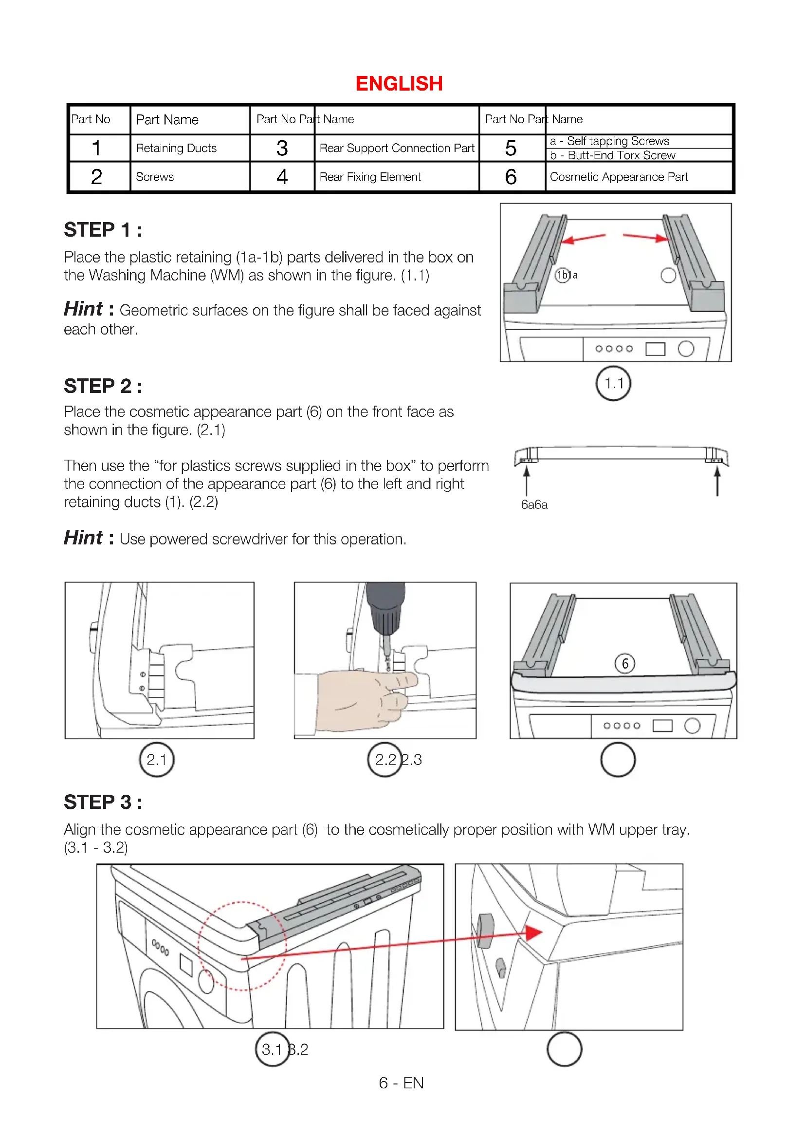 Vida bağlantısı sırasında yalnızca yıldız uçlu tornavida kullanın. 4a6 - EN STEP 1 : Place the plastic retaining (1a-1b) parts delivered in the box on the Washing Machine (WM) as shown in the figure. (1.1) Hint : Geometric surfaces on the figure shall be faced against each other. STEP 2 : Place the cosmetic appearance part (6) on the front face as shown in the figure. (2.1) Then use the “for plastics screws supplied in the box” to perform the connection of the appearance part (6) to the left and right retaining ducts (1). (2.2) Hint : Use powered screwdriver for this operation. STEP 3 : Align the cosmetic appearance part (6) to the cosmetically proper position with WM upper tray. (3.1 - 3.2) Part NoPart Name Retaining Ducts ScrewsPart No Part Name Rear Support Connection Part Rear Fixing ElementPart No Part Name a - Self tapping Screwsb - Butt-End Torx Screw Cosmetic Appearance Part1b 1a 6a 6a