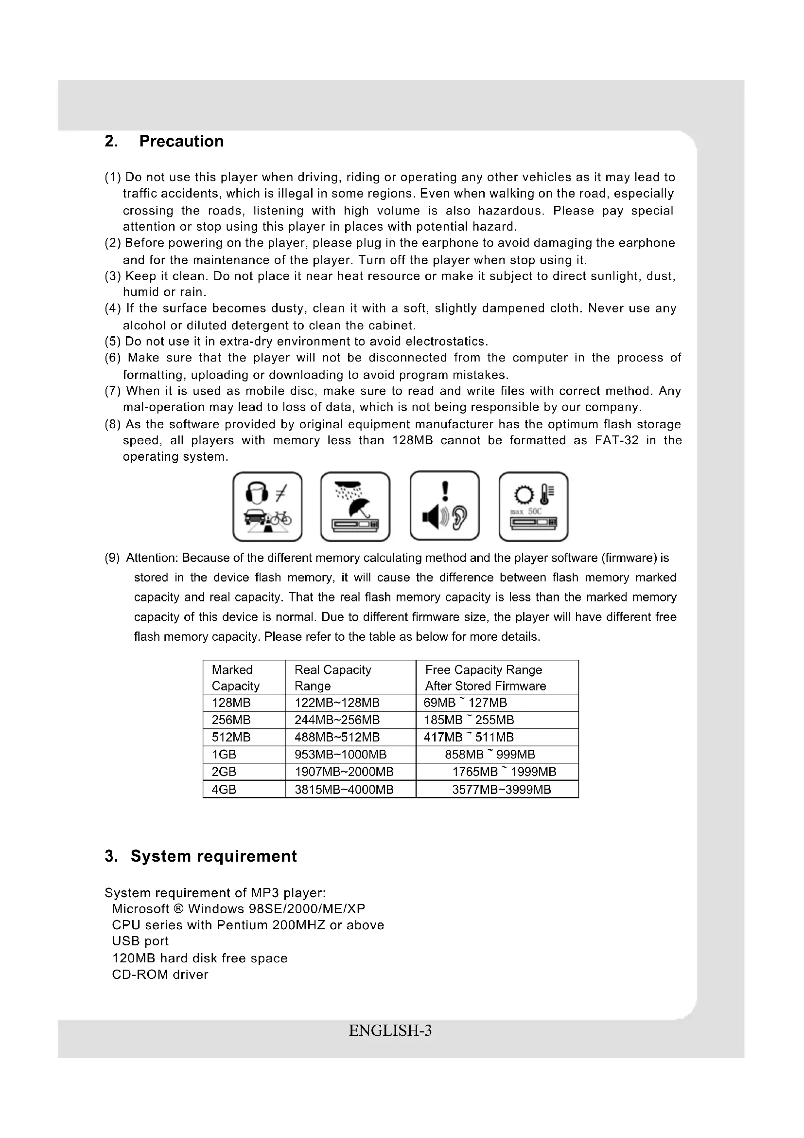 (9) Attention: Because of the different memory calculating method and the player software (firmware) is stored in the device flash memory, it will cause the difference between flash memory marked capacity and real capacity. That the real flash memory capacity is less than the marked memory capacity of this device is normal. Due to different firmware size, the player will have different free flash memory capacity. Please refer to the table as below for more details. Marked Capacity Real Capacity Range Free Capacity Range After Stored Firmware 128MB 122MB~128MB 69MBං127MB 256MB 244MB~256MB 185MBං255MB 512MB 488MB~512MB 417MBං511MB 1GB 953MB~1000MB 858MBං999MB 2GB 1907MB~2000MB 1765MBං1999MB 4GB 3815MB~4000MB 3577MB~3999MB