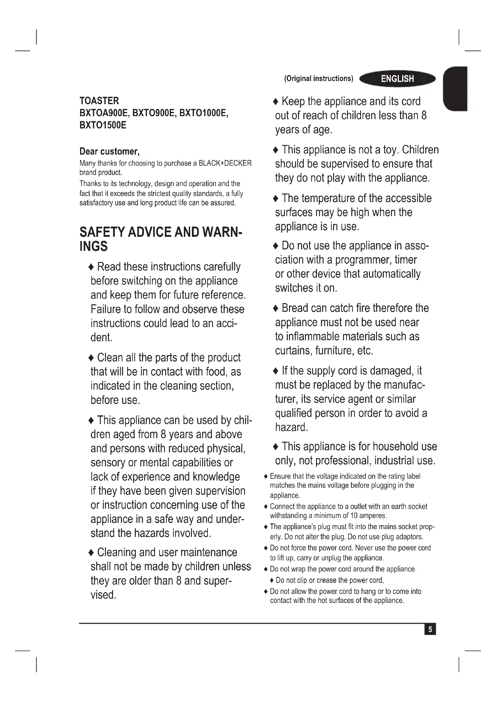 TOASTER BXTOA900E, BXTO900E, BXTO1000E, BXTO1500E Dear customer, Many thanks for choosing to purchase a BLACK+DECKER brand product. Thanks to its technology, design and operation and the fact that it exceeds the strictest quality standards, a fully satisfactory use and long product life can be assured.