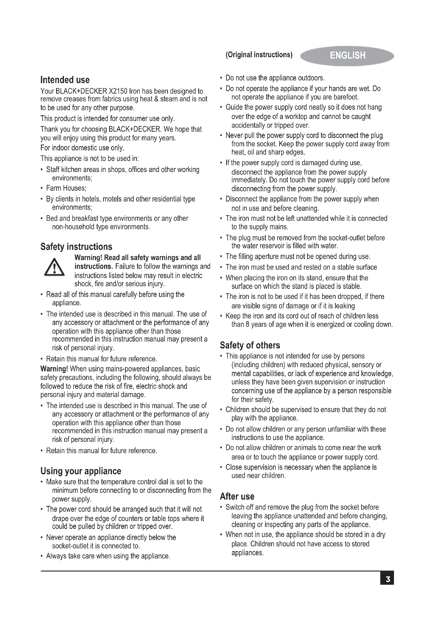 ENGLISH (Original instructions) Intended use Your BLACK+DECKER X2150 Iron has been designed to remove creases from fabrics using heat & steam and is not to be used for any other purpose. This product is intended for consumer use only. Thank you for choosing BLACK+DECKER. We hope that you will enjoy using this product for many years. For indoor domestic use only. This appliance is not to be used in: