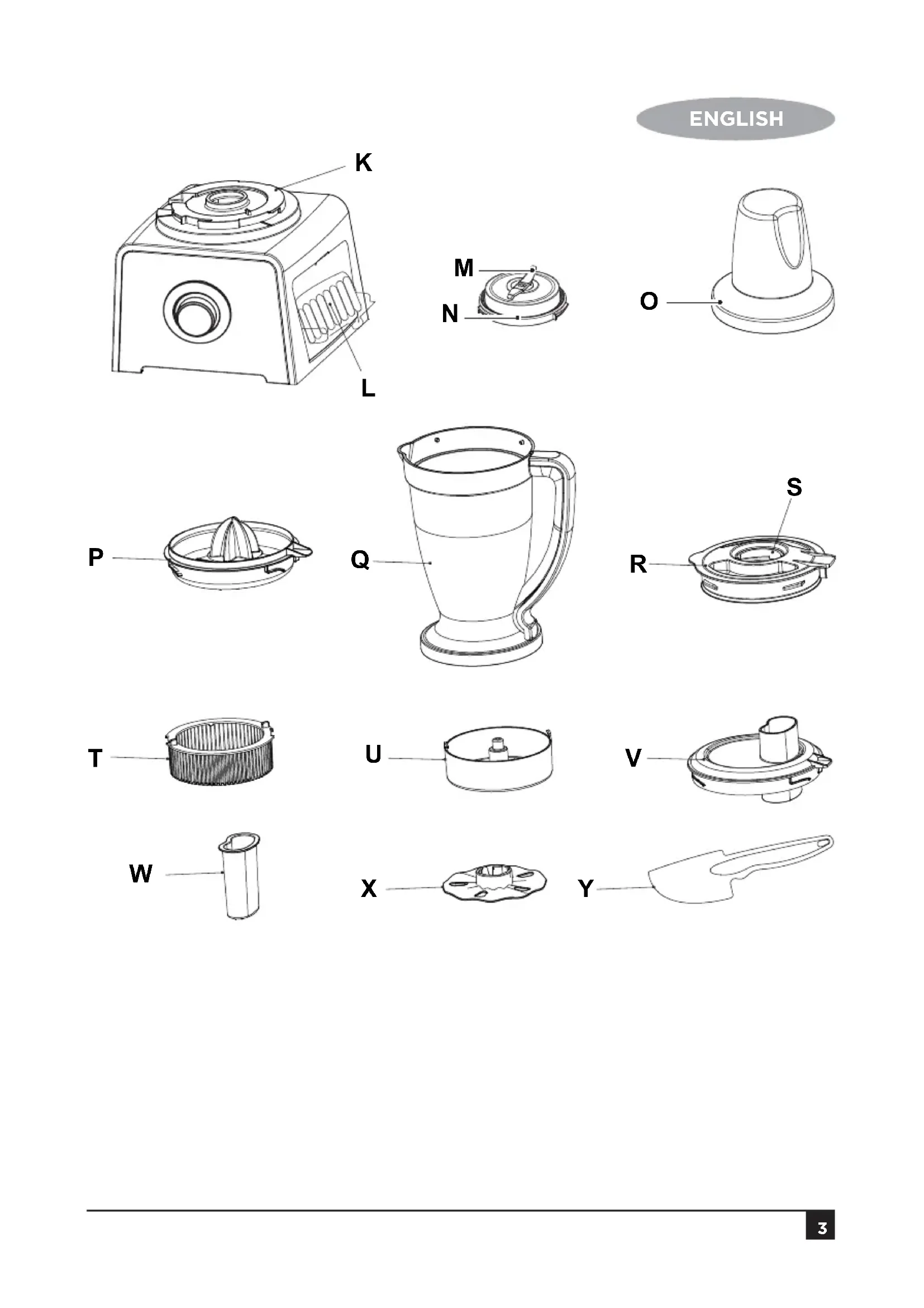 WIntended use Your Black & Decker appliance comes with accessories to perform these functions: Blade for chopping, beating, creaming, crumbling, cutting, folding in, mashing, mincing, mixing & kneading. Blades for coarse, medium and fine grating and shredding vegetables, fruits and cheese. Slicing blades for coarse and fine slicing of vegetables and fruits. Blender for blending, crushing, foaming, grinding, pureeing, homogenizing, liquidising, milling, shaking and stirring. Grinder mill for grinding coee, herbs and spices. Juice Extractor attachment for juicing and pulping non-citrus fruits. Citrus Juice Extractor for juicing and pulping of citrus fruits. Warning! Do not use the centrifugal juicer if the rotating sieve is damaged or has visible cracks This appliance is intended for use in household and similar applications such as: sta kitchen areas in shops, oces and other working environments; farm houses; by clients in hotels, motels and other residential type environments; bed and breakfast type environments. Do not use this appliance for any other purpose. This product is intended for indoor household use only. Read this entire manual carefully before using the appliance. Safety instructions