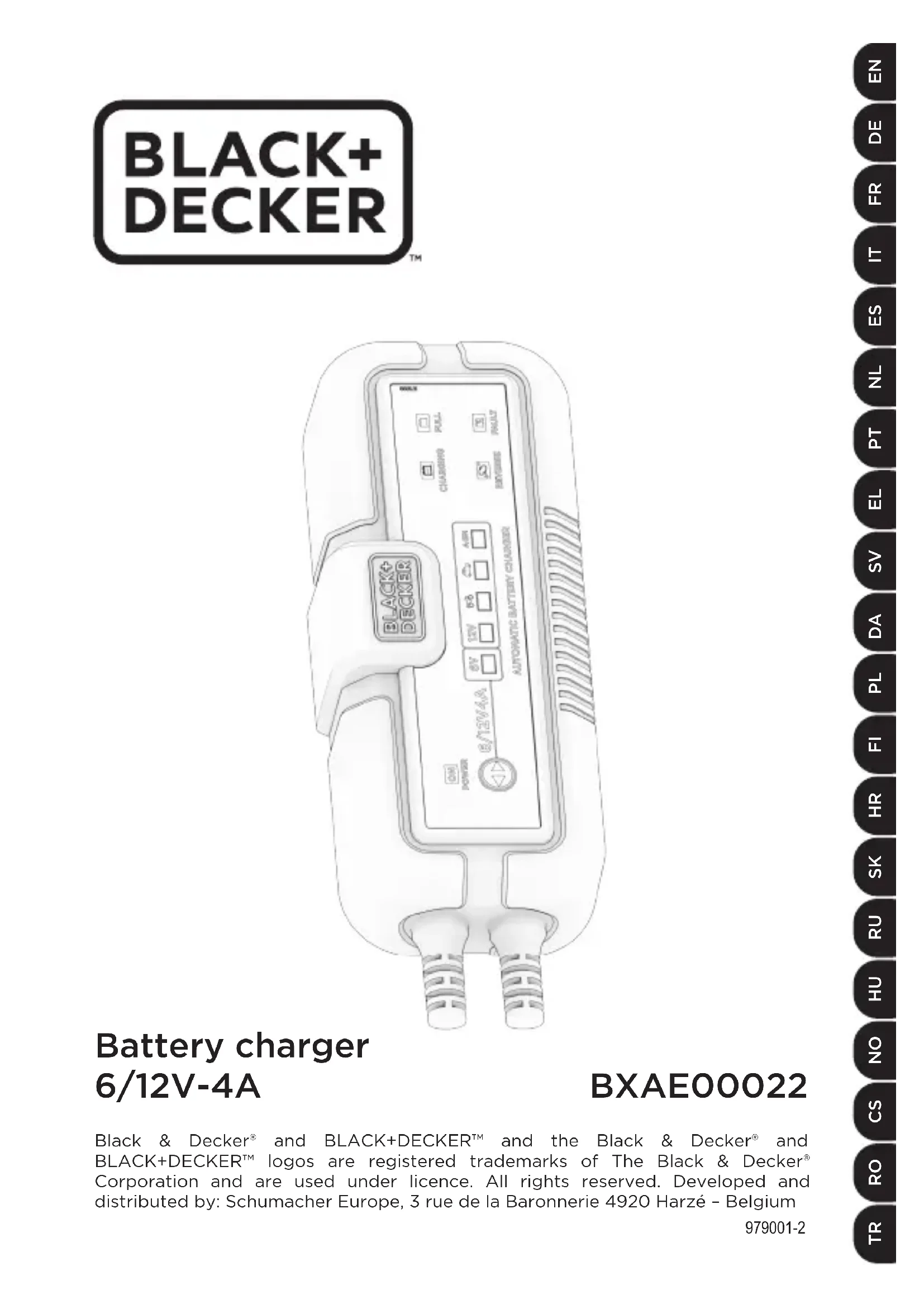 ENDEFRITESNLPTELSVDA PLFIHRSKRUHUNOCSROTR BXAE00022 Battery charger 6/12V-4A Black & Decker® and BLACK+DECKER™ and the Black & Decker® and BLACK+DECKER™ logos are registered trademarks of The Black & Decker® Corporation and are used under licence. All rights reserved. Developed and distributed by: Schumacher Europe, 3 rue de la Baronnerie 4920 Harzé – Belgium 979001-2EN