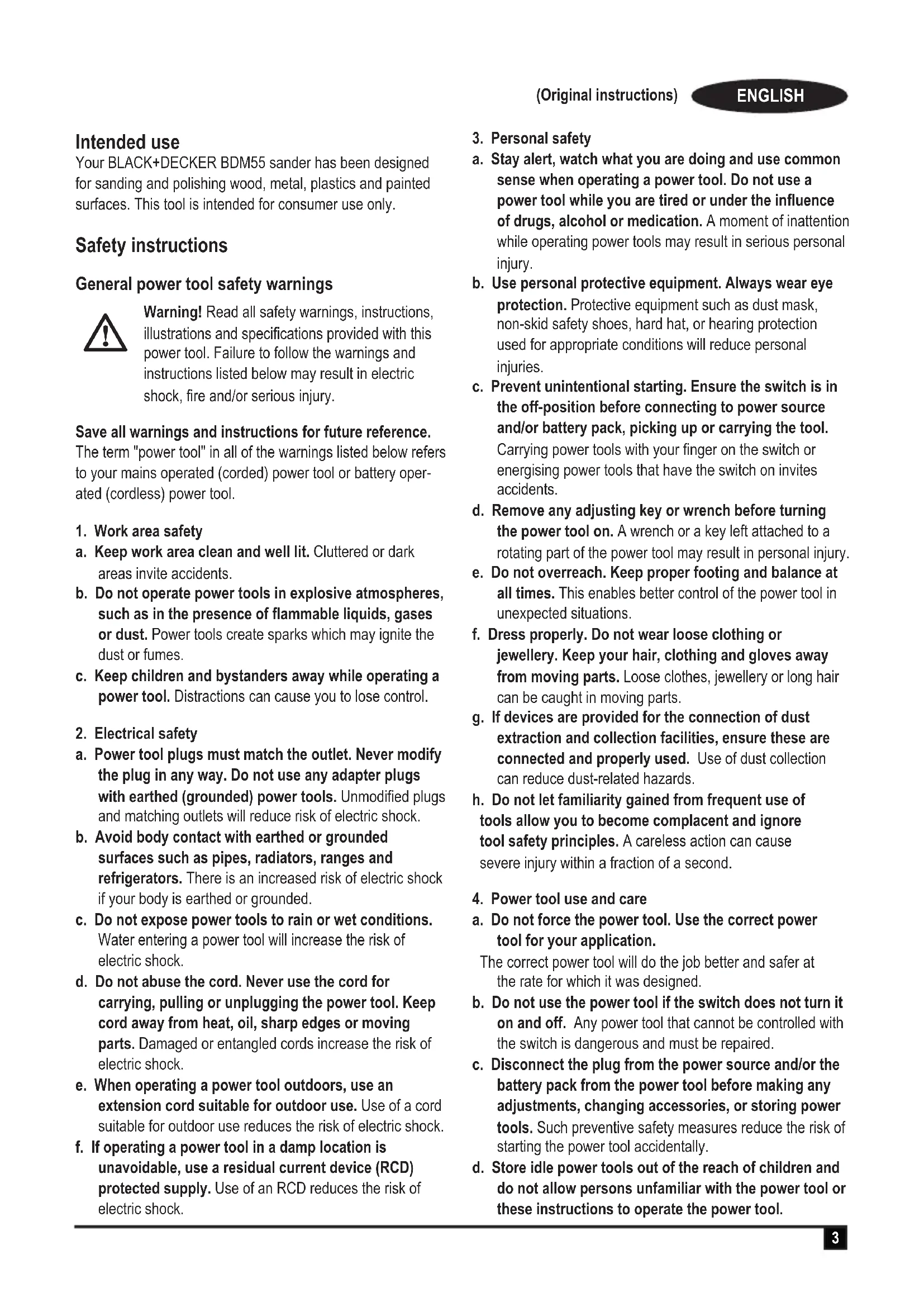 Intended use Your BLACK+DECKER BDM55 sander has been designed for sanding and polishing wood, metal, plastics and painted surfaces. This tool is intended for consumer use only. Safety instructions General power tool safety warnings