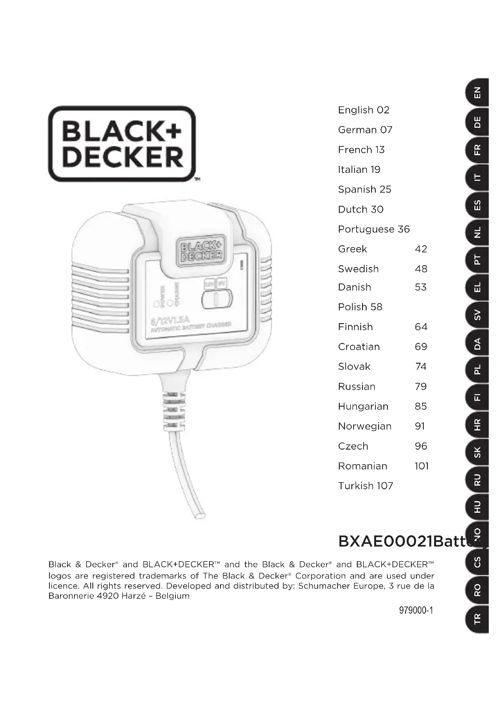 BXAE00021Battery charger 6/12V-1.5A Black & Decker® and BLACK+DECKER™ and the Black & Decker® and BLACK+DECKER™ logos are registered trademarks of The Black & Decker® Corporation and are used under licence. All rights reserved. Developed and distributed by: Schumacher Europe, 3 rue de la Baronnerie 4920 Harzé – Belgium 979000-1 English 02 German 07 French 13 Italian 19 Spanish 25 Dutch 30 Portuguese 36 Greek 42 Swedish 48 Danish 53 Polish 58 Finnish 64 Croatian 69 Slovak 74 Russian 79 Hungarian 85 Norwegian 91 Czech 96 Romanian 101 Turkish 1072 EN - English Instructions for use