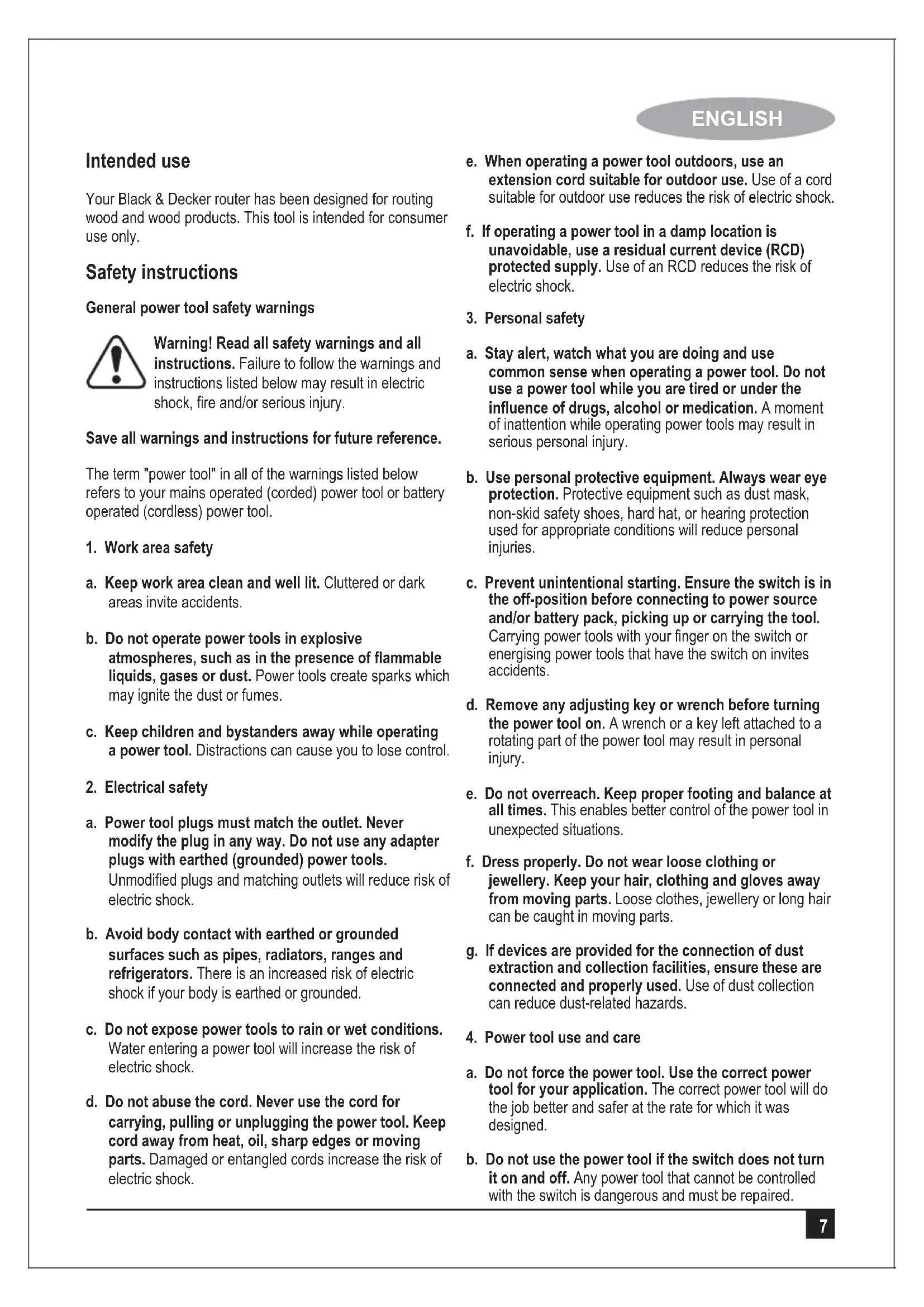 ENGLISH Intended use Your Black & Decker router has been designed for routing wood and wood products. This tool is intended for consumer use only. Safety instructions General power tool safety warnings Warning! Read all safety warnings and all instructions. Failure to follow the warnings and instructions listed below may result in electric shock, fire and/or serious injury. Save all warnings and instructions for future reference. The term "power tool" in all of the warnings listed below refers to your mains operated (corded) power tool or battery operated (cordless) power tool.