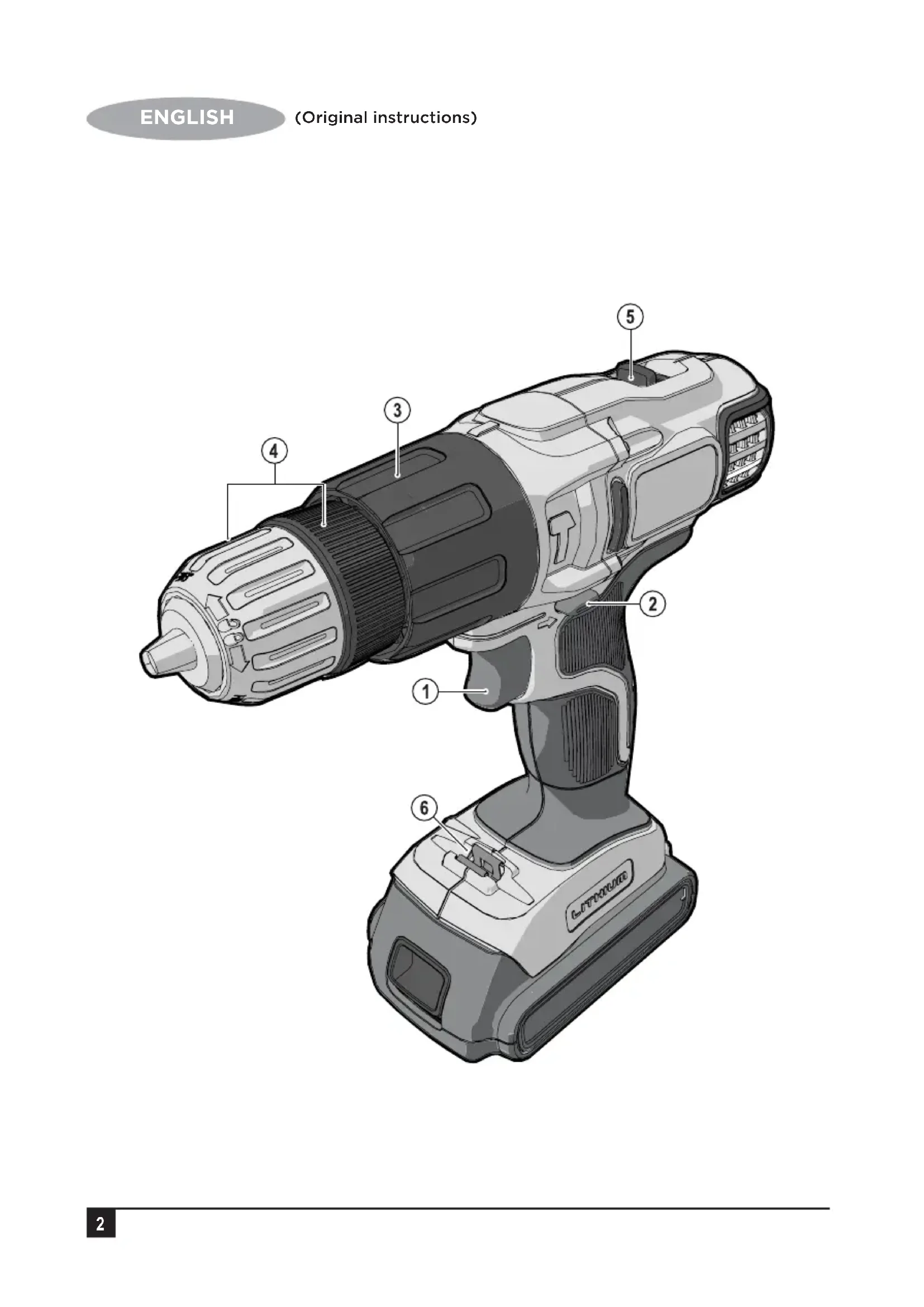 - For drilling in materials other than steel, slide the speed selector (5) towards the front of the tool (2nd gear). Drilling/screwdriving