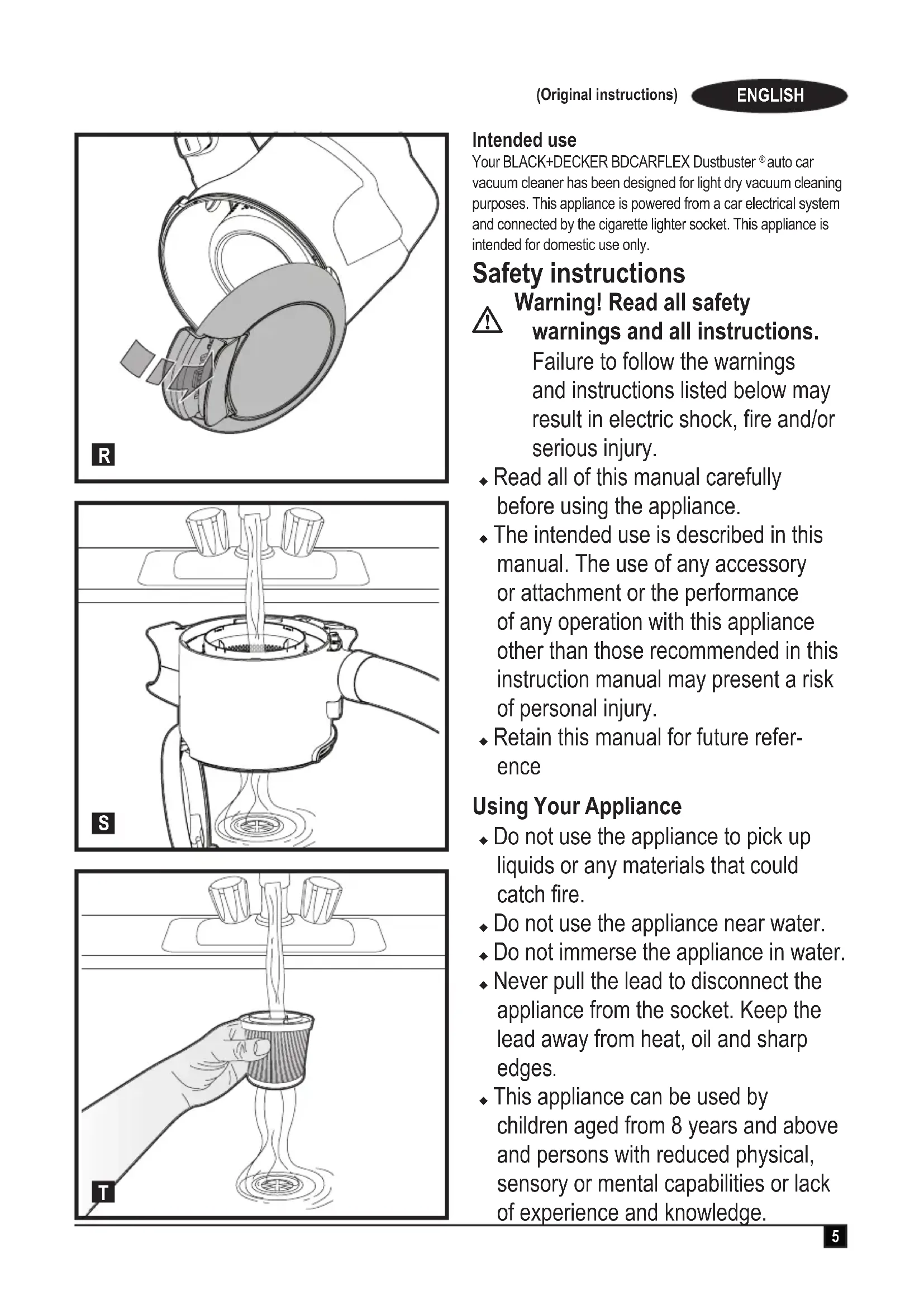 Assembly Mounting accessories (g. B, C, D, E, F & G) The 2-in-1 combi nozzle (11) has a brush that can be folded forward for dusting and upholstery cleaning u To t an accessory press the accessory clip (11) and slide the accessory onto the handle (2) (Fig. B & C). u To remove an accessory, press the accessory clip (11) and remove the accessory. The handle (2) can be removed from the hose (4) allowing the accessories to be connected directly to the hose when required. To remove the handle: u Unclip the handle (2) from the appliance. u Rotate the locking ring (3) anti-clockwise to release the clips (Fig. D). u Pull the hose (4) away from the handle (2) (Fig. E). u Fit the accessory directly to the hose cuff (3) (Fig. F) To ret the handle: u Remove the accessory from the hose. u Push the hose (4) into the handle (2). Rotate the locking ring (3) clockwise until it clicks into place Use Connecting to the vehicle’s power supply u Make sure that the appliance is switched off. u Remove the cigarette lighter from it’s socket. u Plug the connector (6) into the cigarette lighter socket. Switching on and off (g. A) u To switch on, slide the on/off switch (1) to the right. u To switch off, slide the on/off switch (1) to the left until it clicks into the off position. The appliance can be used for periods of up to 30 minutes without noticeably affecting the power of a normally charged car battery in good condition. Warning! Extended use will drain the battery power. Do not run the vehicle’s engine while cleaning as this can shorten the life of the appliance. Vacuuming u When operating the appliance, make sure that the hose is not trapped, twisted or blocked. u The handle (2) can be easily removed from the appliance allowing you to reach up to 1.5 m from the appliance. u With the handle (2) removed, the appliance can be carried using the built-in handle. u The handle (2) can also be removed from the hose (4) so that you can connect an accessory directly to the hosecuff (3) when required. Cleaning and maintenance Cleaning the dust bowl (g. H, I, J, K, ) Your BLACK+DECKER tool has been designed to operate over a long period of time with a minimum of maintenance. Continuous satisfactory operation depends upon proper care and regular cleaning u Release the door latch (7) and open the transparent door (5) 180° until it clicks in the open position. u Empty the dust container by lightly shaking over a dustbin u Close the transparent door (5) and make sure that it clicks into place. Cleaning the lters (g. L, M, N, O, P, Q, R, S, T ) u Press the bowl release button (9) (g. L) u Rotate bowl (g. M) u Seperate dust bowl from appliance (g. N). u Clean the lter by rotating 3 times counterclockwise (g. K). u Lift the lter from the dust bowl (g. P) and brush off any loose dust. u Empty any remaining dust from the dust bowl (g. Q). u Ensure the dust bowl is open (g. R). u Rinse out the dustbowl with warm soapy water (g. S). u Wash the lters with warm soapy water (g. T). u Make sure the lters are dry u Ret the lters onto the appliance twisting them clockwise until they lock into place. u Close the dustbowl door. Make sure the release latch (8) clicks into place. Warning! Before performing any maintenance or cleaning on the appliance, unplug the appliance. From time to time wipe the appliance with a damp cloth. Do not use any abrasive or solvent-based cleaner. Do not immerse the appliance in water Replacing the lters The lters should be replaced every 6 to 9 months and whenever worn or damaged. Replacement lters are available from your BLACK+DECKER dealer (cat. no PD10): u Remove the old lters as described above.(Übersetzung der ursprünglichen Anweisungen) DEUTSCH