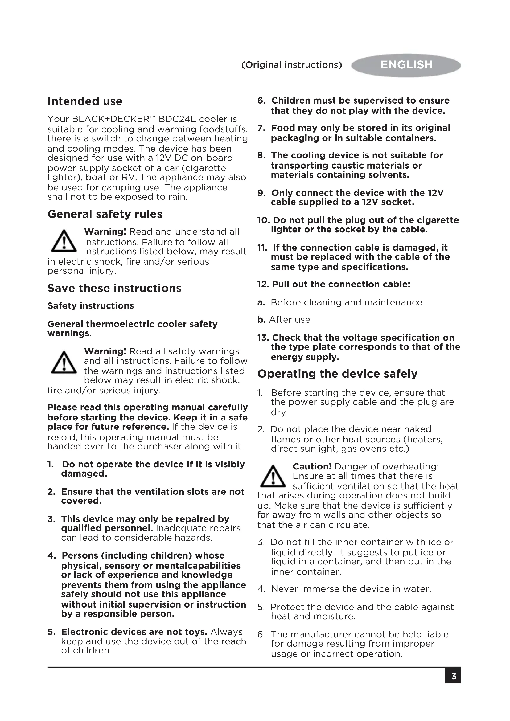ENGLISH (Original instructions) Intended use Your BLACK+DECKER™ BDC24L cooler is suitable for cooling and warming foodstus. there is a switch to change between heating and cooling modes. The device has been designed for use with a 12V DC on-board power supply socket of a car (cigarette lighter), boat or RV. The appliance may also be used for camping use. The appliance shall not to be exposed to rain. General safety rules Warning! Read and understand all instructions. Failure to follow all instructions listed below, may result in electric shock, fire and/or serious personal injury. Save these instructions Safety instructions General thermoelectric cooler safety warnings. Warning! Read all safety warnings and all instructions. Failure to follow the warnings and instructions listed below may result in electric shock, fire and/or serious injury. Please read this operating manual carefully before starting the device. Keep it in a safe place for future reference. If the device is resold, this operating manual must be handed over to the purchaser along with it.