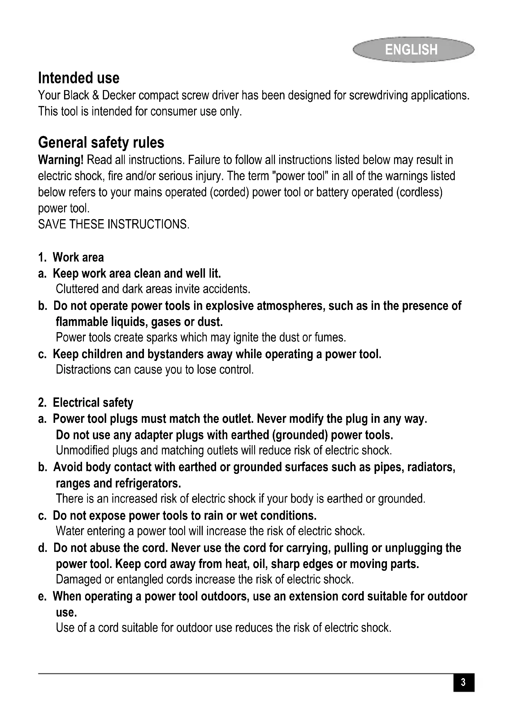 ENGLISH Intended use Your Black & Decker compact screw driver has been designed for screwdriving applications. This tool is intended for consumer use only. General safety rules Warning! Read all instructions. Failure to follow all instructions listed below may result in electric shock, fire and/or serious injury. The term "power tool" in all of the warnings listed below refers to your mains operated (corded) power tool or battery operated (cordless) power tool. SAVE THESE INSTRUCTIONS.