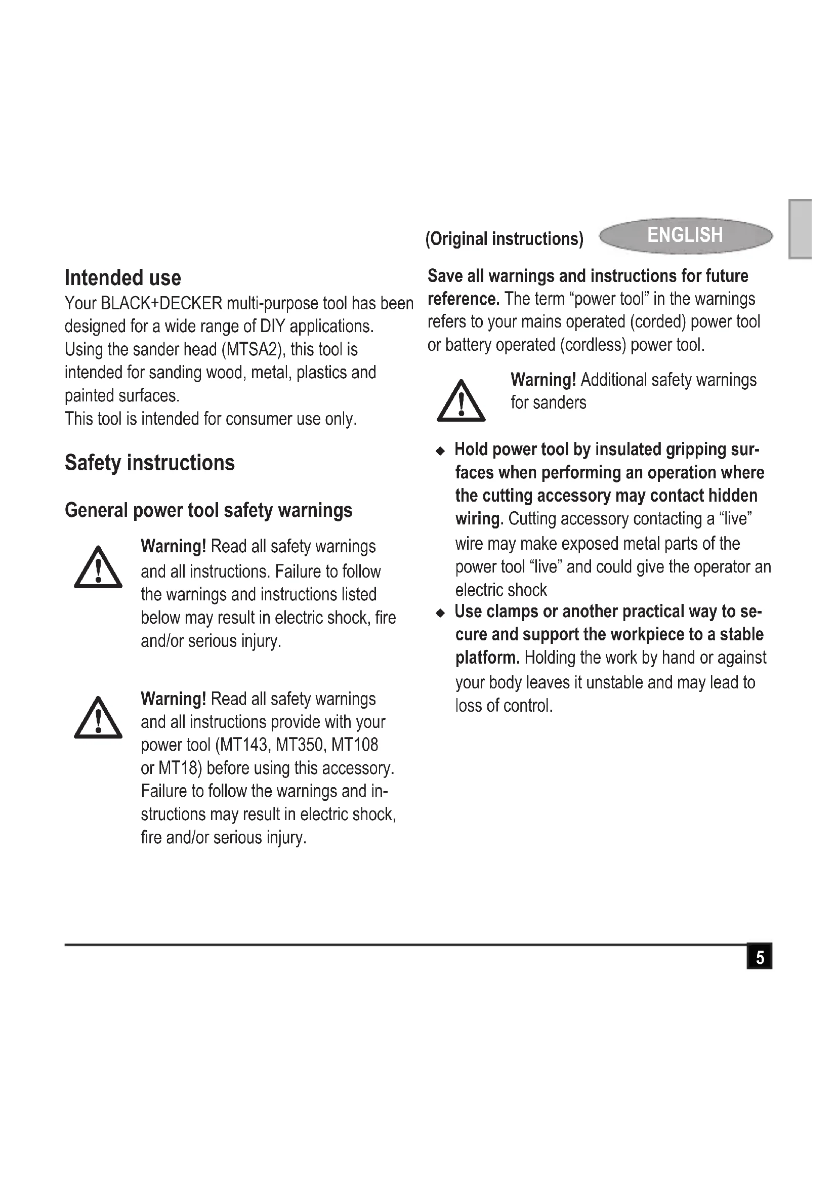 ENGLISH (Original instructions) Intended use Your BLACK+DECKER multi-purpose tool has been designed for a wide range of DIY applications. Using the sander head (MTSA2), this tool is intended for sanding wood, metal, plastics and painted surfaces. This tool is intended for consumer use only. Safety instructions General power tool safety warnings