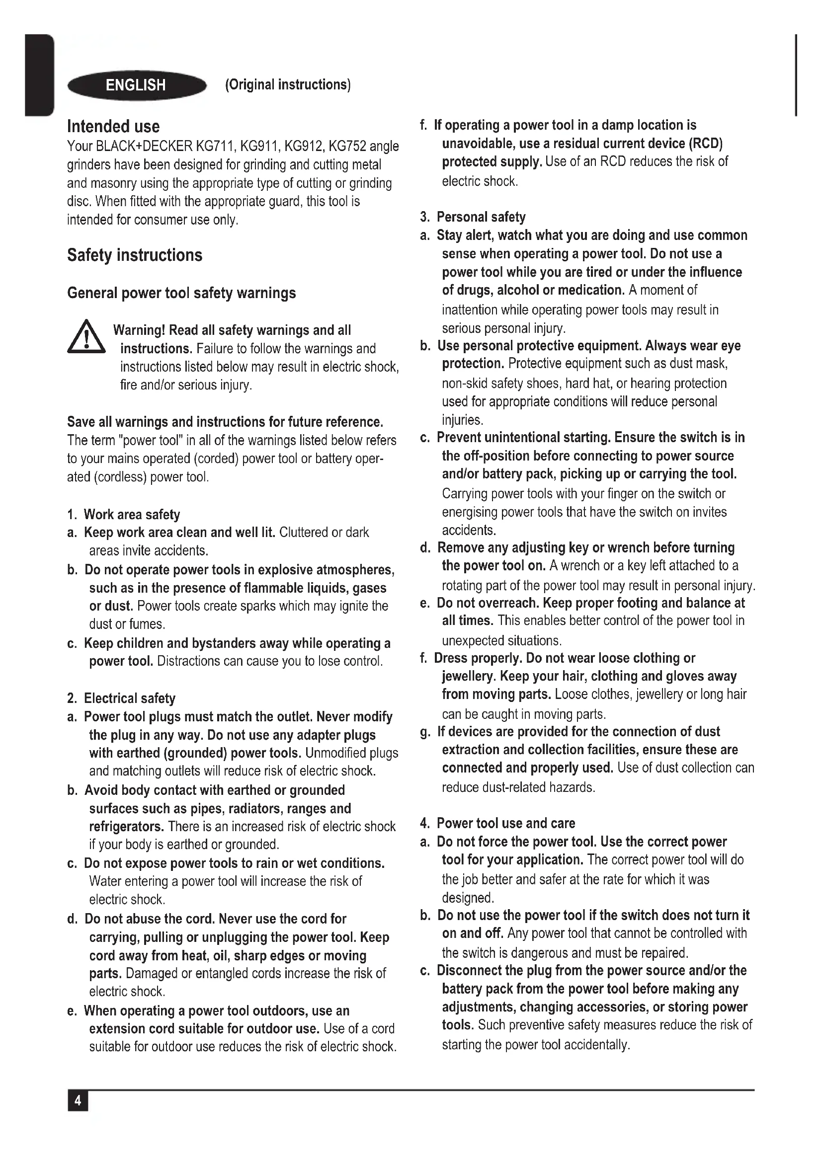 ENGLISH (Original instructions) Intended use Your BLACK+DECKER KG711, KG911, KG912, KG752 angle grinders have been designed for grinding and cutting metal and masonry using the appropriate type of cutting or grinding disc. When tted with the appropriate guard, this tool is intended for consumer use only. Safety instructions General power tool safety warnings