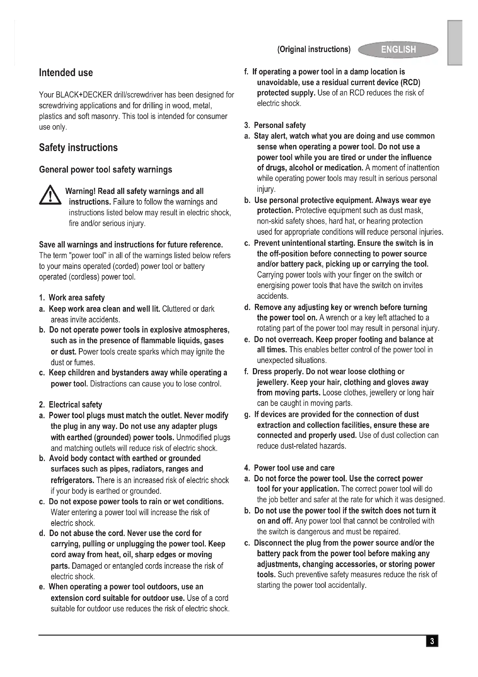 a. Do not force the power tool. Use the correct power tool for your application. The correct power tool will do the job better and safer at the rate for which it was designed. b. Do not use the power tool if the switch does not turn it on and off. Any power tool that cannot be controlled with the switch is dangerous and must be repaired. c. Disconnect the plug from the power source and/or the battery pack from the power tool before making any adjustments, changing accessories, or storing power tools. Such preventive safety measures reduce the risk of starting the power tool accidentally. Intended use Your BLACK+DECKER drill/screwdriver has been designed for screwdriving applications and for drilling in wood, metal, plastics and soft masonry. This tool is intended for consumer use only. Safety instructions General power tool safety warnings