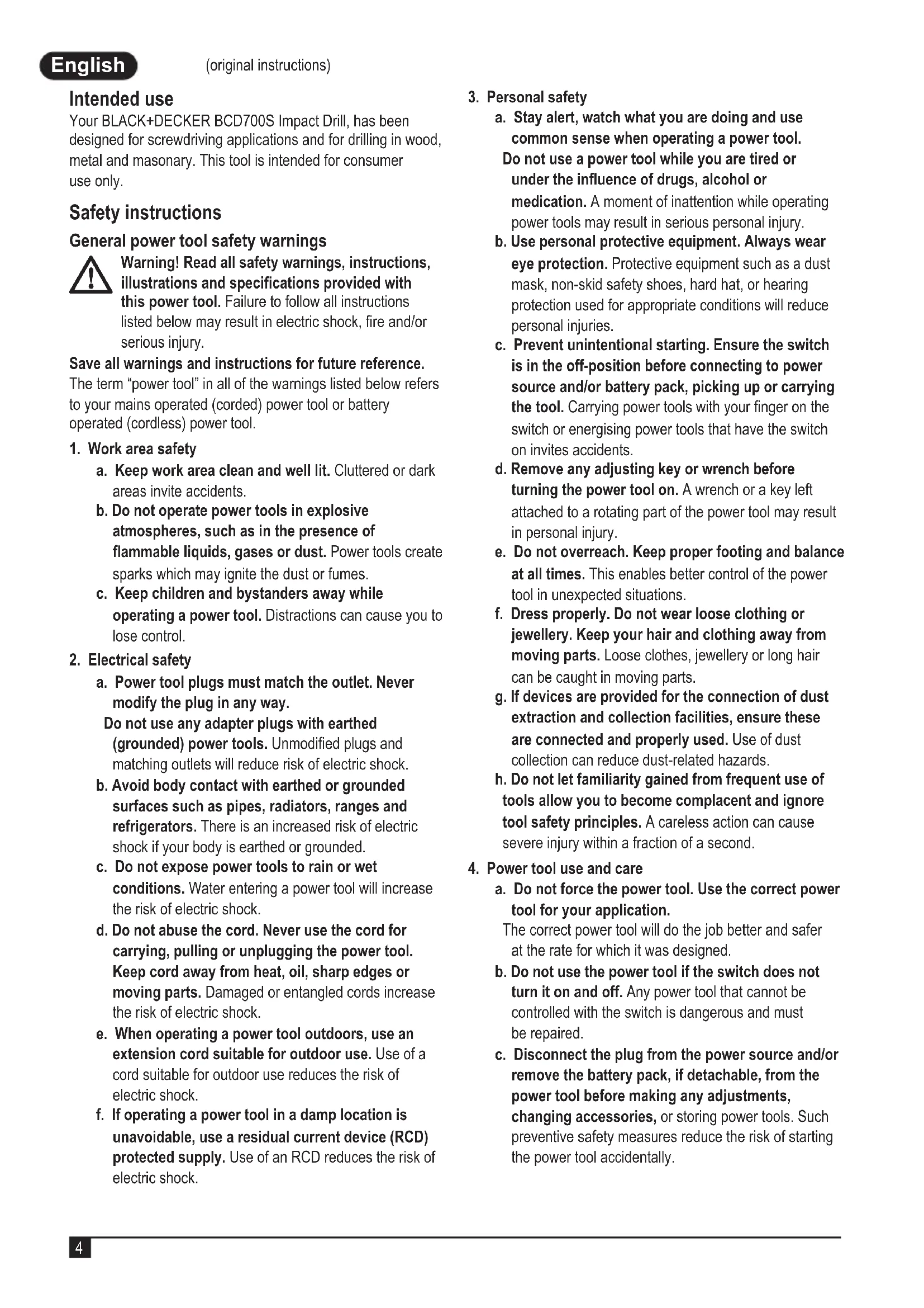 (original instructions) English (original instructions) Intended use Your BLACK+DECKER BCD700S Impact Drill, has been designed for screwdriving applications and for drilling in wood, metal and masonary. This tool is intended for consumer use only. Safety instructions General power tool safety warnings