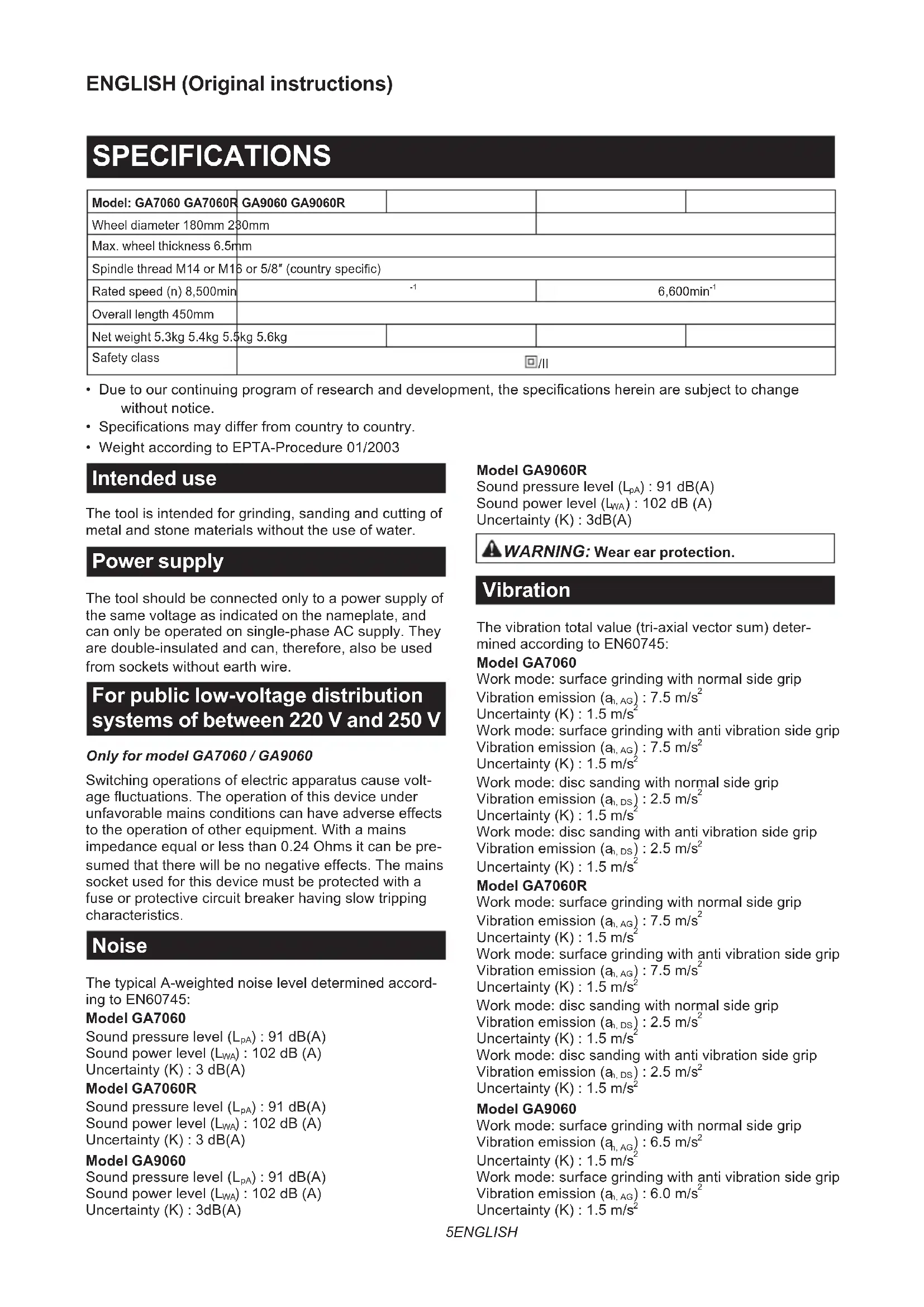 - Weight according to EPTA-Procedure 01/2003 Intended use The tool is intended for grinding, sanding and cutting of metal and stone materials without the use of water. Power supply The tool should be connected only to a power supply of the same voltage as indicated on the nameplate, and can only be operated on single-phase AC supply. They are double-insulated and can, therefore, also be used from sockets without earth wire. For public low-voltage distribution systems of between 220 V and 250 V Only for model GA7060 / GA9060 Switching operations of electric apparatus cause volt- age uctuations. The operation of this device under unfavorable mains conditions can have adverse effects to the operation of other equipment. With a mains impedance equal or less than 0.24 Ohms it can be pre- sumed that there will be no negative effects. The mains socket used for this device must be protected with a fuse or protective circuit breaker having slow tripping characteristics. Noise The typical A-weighted noise level determined accord- ing to EN60745: Model GA7060 Sound pressure level (L