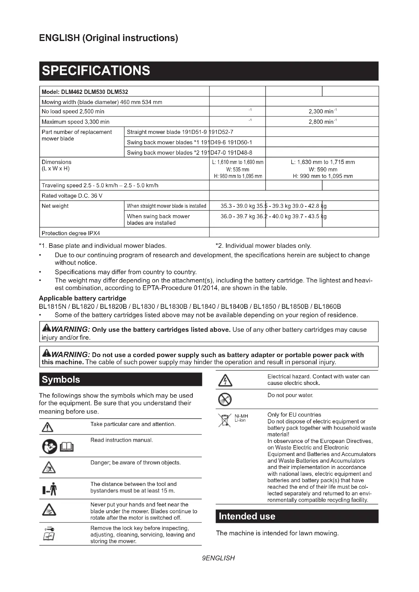 this machine.Thecableofsuchpowersupplymayhindertheoperationandresultinpersonalinjury. Symbols The followings show the symbols which may be used for the equipment. Be sure that you understand their meaning before use. Take particular care and attention. Read instruction manual. Danger;beawareofthrownobjects. The distance between the tool and bystanders must be at least 15 m. Never put your hands and feet near the blade under the mower. Blades continue to rotateafterthemotorisswitchedo. Remove the lock key before inspecting, adjusting,cleaning,servicing,leavingand storing the mower. Electrical hazard. Contact with water can cause electric shock. Do not pour water. Ni-MH Li-ion Only for EU countries Do not dispose of electric equipment or battery pack together with household waste material! In observance of the European Directives, on Waste Electric and Electronic Equipment and Batteries and Accumulators and Waste Batteries and Accumulators and their implementation in accordance with national laws, electric equipment and batteries and battery pack(s) that have reached the end of their life must be col- lected separately and returned to an envi- ronmentally compatible recycling facility. Intended use The machine is intended for lawn mowing.10 ENGLISH Noise The typical A-weighted noise level determined accord- ing to EN60335-2-77: NOTE: The values have been measured with the mower equipped with the straight mower blade. Model DLM462 Sound pressure level (L