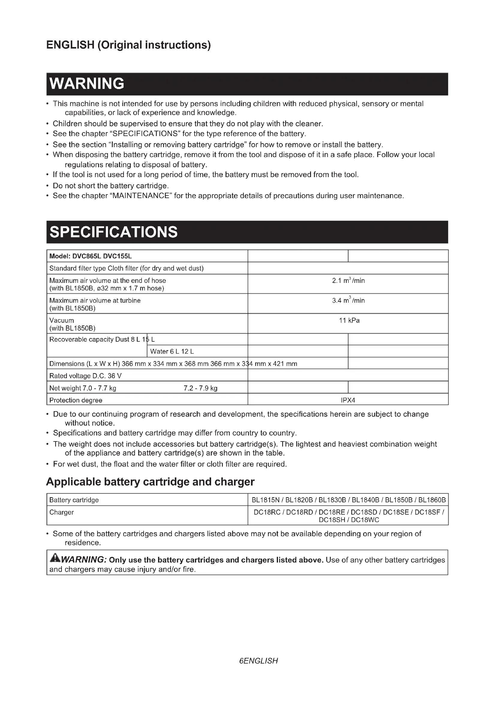- See the chapter “MAINTENANCE” for the appropriate details of precautions during user maintenance. SPECIFICATIONS Model: DVC865L DVC155L Standard lter type Cloth lter (for dry and wet dust) Maximum air volume at the end of hose (with BL1850B, ø32 mm x 1.7 m hose)