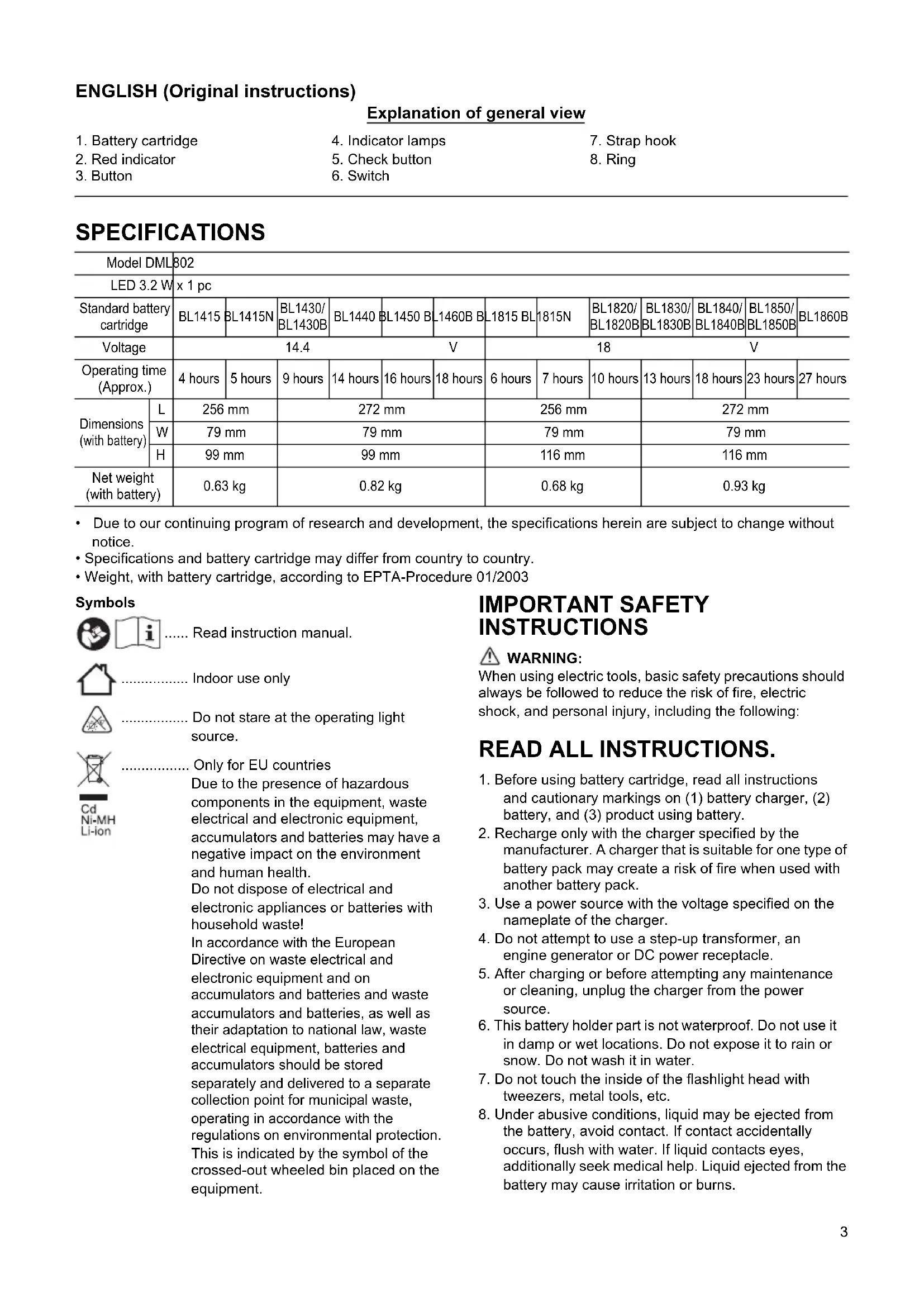 - Weight, with battery cartridge, according to EPTA-Procedure 01/2003 Symbols ...... Read instruction manual. ................. Indoor use only ................. Do not stare at the operating light source. ................. Only for EU countries Due to the presence of hazardous components in the equipment, waste electrical and electronic equipment, accumulators and batteries may have a negative impact on the environment and human health. Do not dispose of electrical and electronic appliances or batteries with household waste! In accordance with the European Directive on waste electrical and electronic equipment and on accumulators and batteries and waste accumulators and batteries, as well as their adaptation to national law, waste electrical equipment, batteries and accumulators should be stored separately and delivered to a separate collection point for municipal waste, operating in accordance with the regulations on environmental protection. This is indicated by the symbol of the crossed-out wheeled bin placed on the equipment. IMPORTANT SAFETY INSTRUCTIONS
