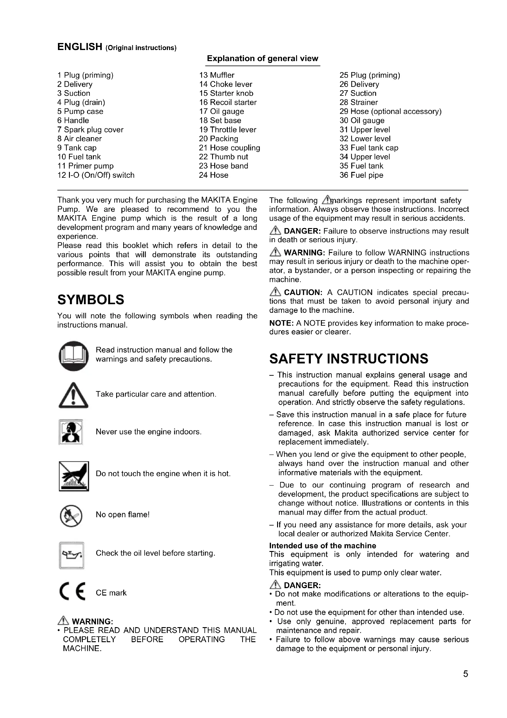 ENGLISH (Original instructions) Explanation of general view 1 Plug (priming) 2 Delivery 3 Suction 4 Plug (drain) 5 Pump case 6 Handle 7 Spark plug cover 8 Air cleaner 9 Tank cap 10 Fuel tank 11 Primer pump 12 I-O (On/Off) switch 13 Muffler 14 Choke lever 15 Starter knob 16 Recoil starter 17 Oil gauge 18 Set base 19 Throttle lever 20 Packing 21 Hose coupling 22 Thumb nut 23 Hose band 24 Hose 25 Plug (priming) 26 Delivery 27 Suction 28 Strainer 29 Hose (optional accessory) 30 Oil gauge 31 Upper level 32 Lower level 33 Fuel tank cap 34 Upper level 35 Fuel tank 36 Fuel pipe Thank you very much for purchasing the MAKITA Engine Pump. We are pleased to recommend to you the MAKITA Engine pump which is the result of a long development program and many years of knowledge and experience. Please read this booklet which refers in detail to the various points that will demonstrate its outstanding performance. This will assist you to obtain the best possible result from your MAKITA engine pump. SYMBOLS You will note the following symbols when reading the instructions manual.