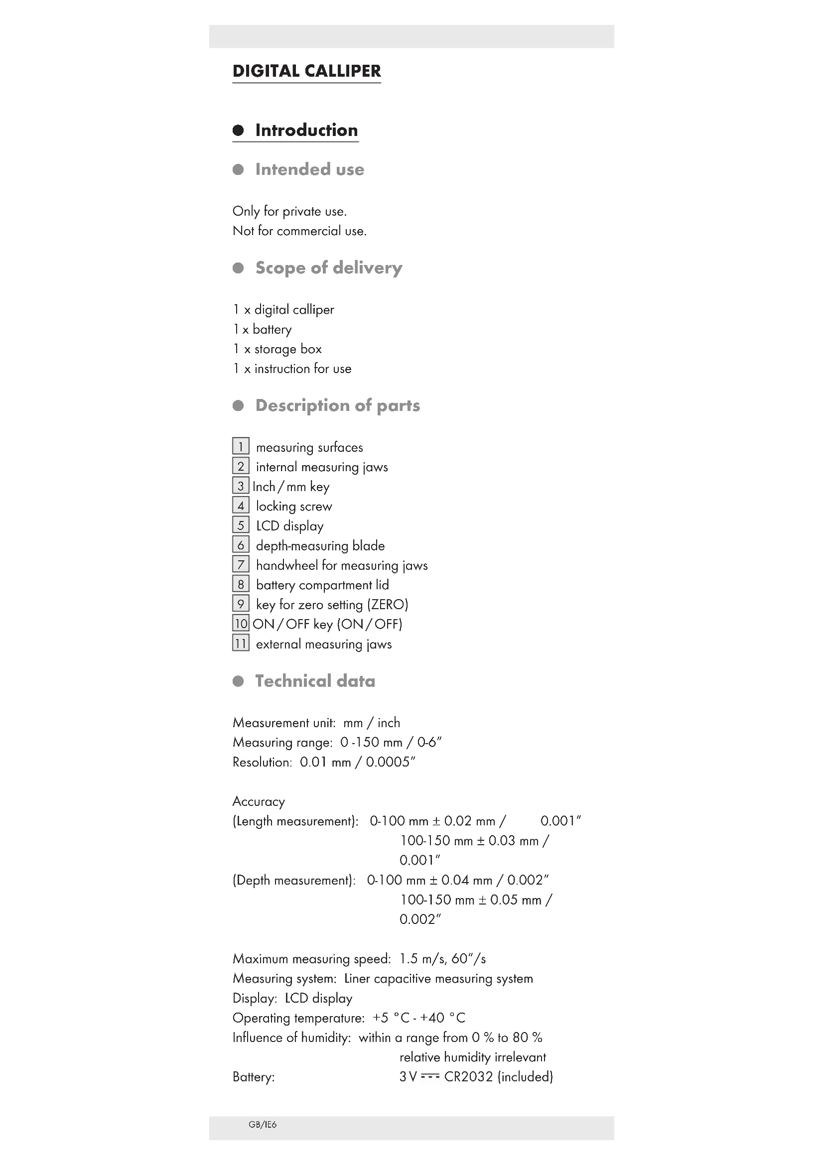 Technical data Measurement unit: mm / inch Measuring range: 0 -150 mm / 0-6” Resolution: 0.01 mm / 0.0005” Accuracy (Length measurement): 0-100 mm ± 0.02 mm / 0.001” 100-150 mm ± 0.03 mm / 0.001” (Depth measurement): 0-100 mm ± 0.04 mm / 0.002” 100-150 mm ± 0.05 mm / 0.002” Maximum measuring speed: 1.5 m/s, 60”/s Measuring system: Liner capacitive measuring system Display: LCD display Operating temperature: +5 °C - +40 °C Influence of humidity: within a range from 0 % to 80 % relative humidity irrelevant Battery: 3 V CR2032 (included)GB/IE 7 Safety instructions