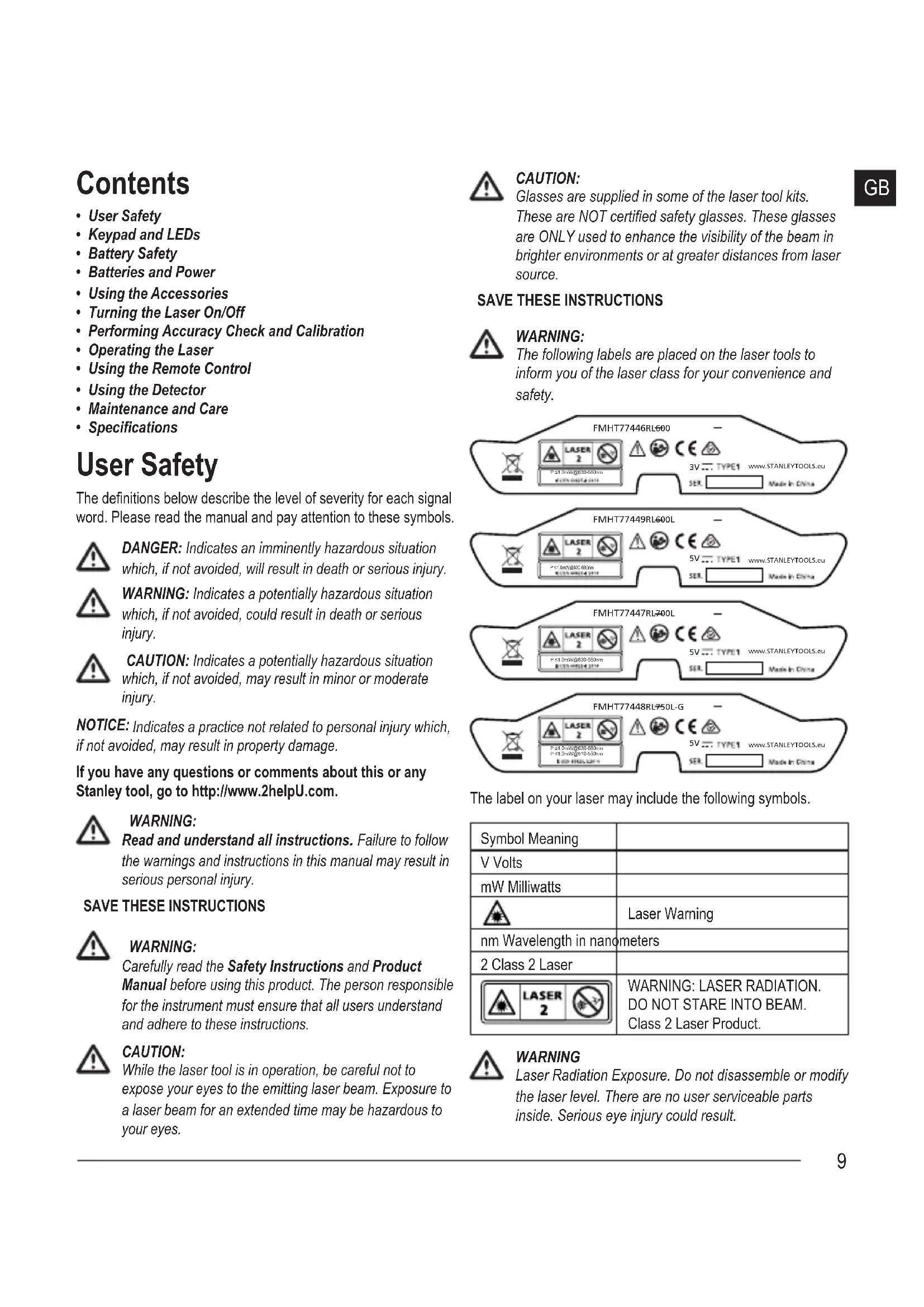 www.STANLEYTOOLS.euP ≤1.0mW@630-680nmP ≤1.0mW@510-530nm The label on your laser may include the following symbols. Symbol Meaning V Volts mW Milliwatts Laser Warning nm Wavelength in nanometers 2 Class 2 Laser