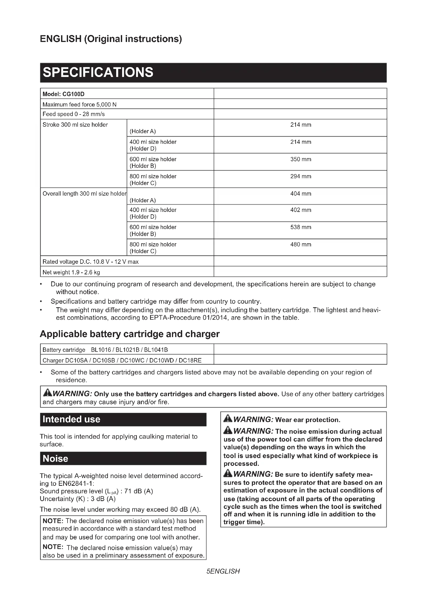 - Theweightmaydierdependingontheattachment(s),includingthebatterycartridge.Thelightestandheavi- estcombinations,accordingtoEPTA-Procedure01/2014,areshowninthetable. Applicable battery cartridge and charger Batterycartridge BL1016 / BL1021B / BL1041B Charger DC10SA/DC10SB/DC10WC/DC10WD/DC18RE