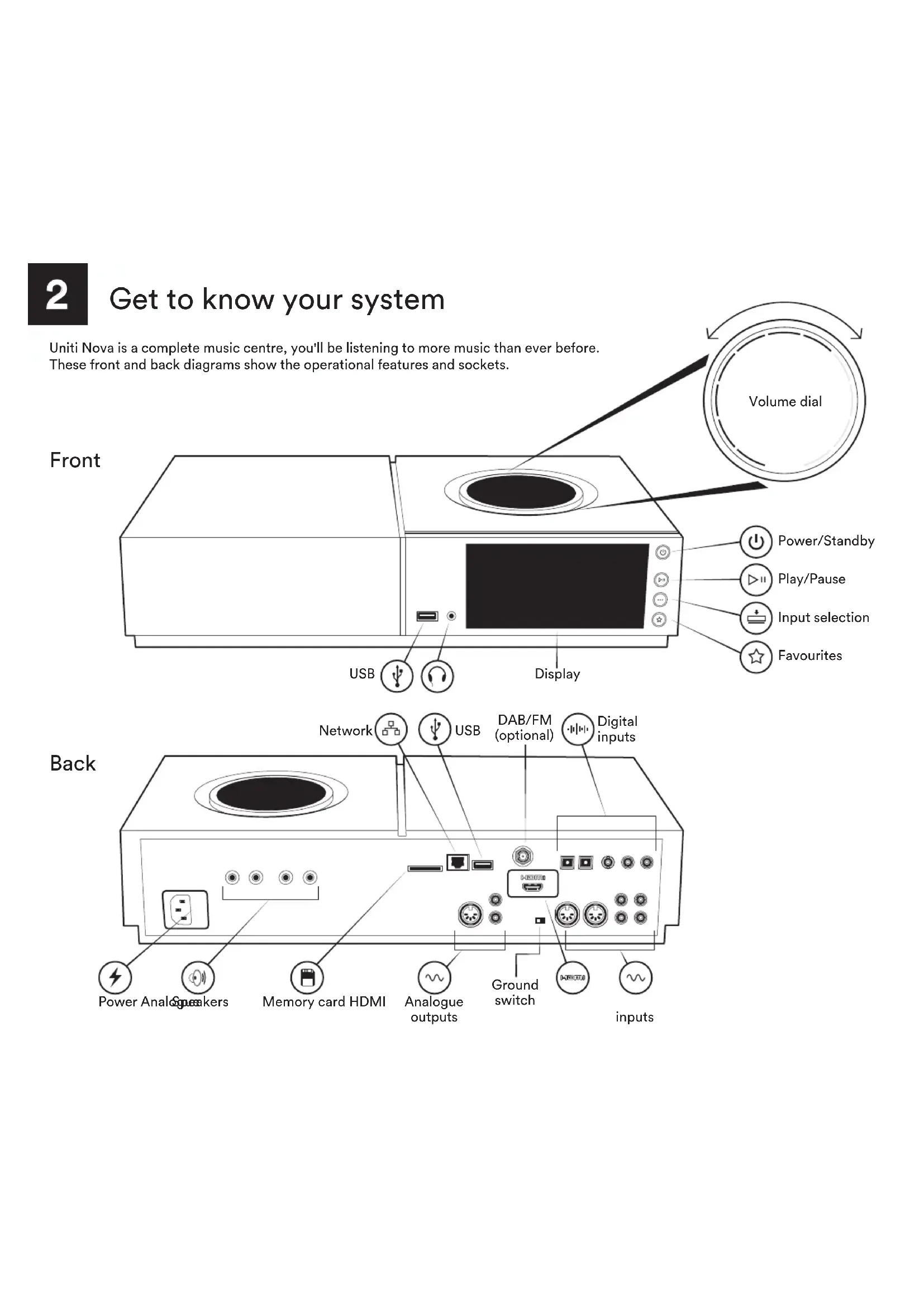 Speaker plugs2 Get to know your system Uniti Nova is a complete music centre, you'll be listening to more music than ever before. These front and back diagrams show the operational features and sockets. Power/Standby Play/Pause Input selection Favourites Volume dial Speakers Memory card HDMI Ground switch USB USB Digital inputs Network Power Analogue inputs Display Analogue outputs DAB/FM (optional) Back FrontRemote Navigation Favourites Inputs Multiroom Battery compartment on reverse Power/Standby