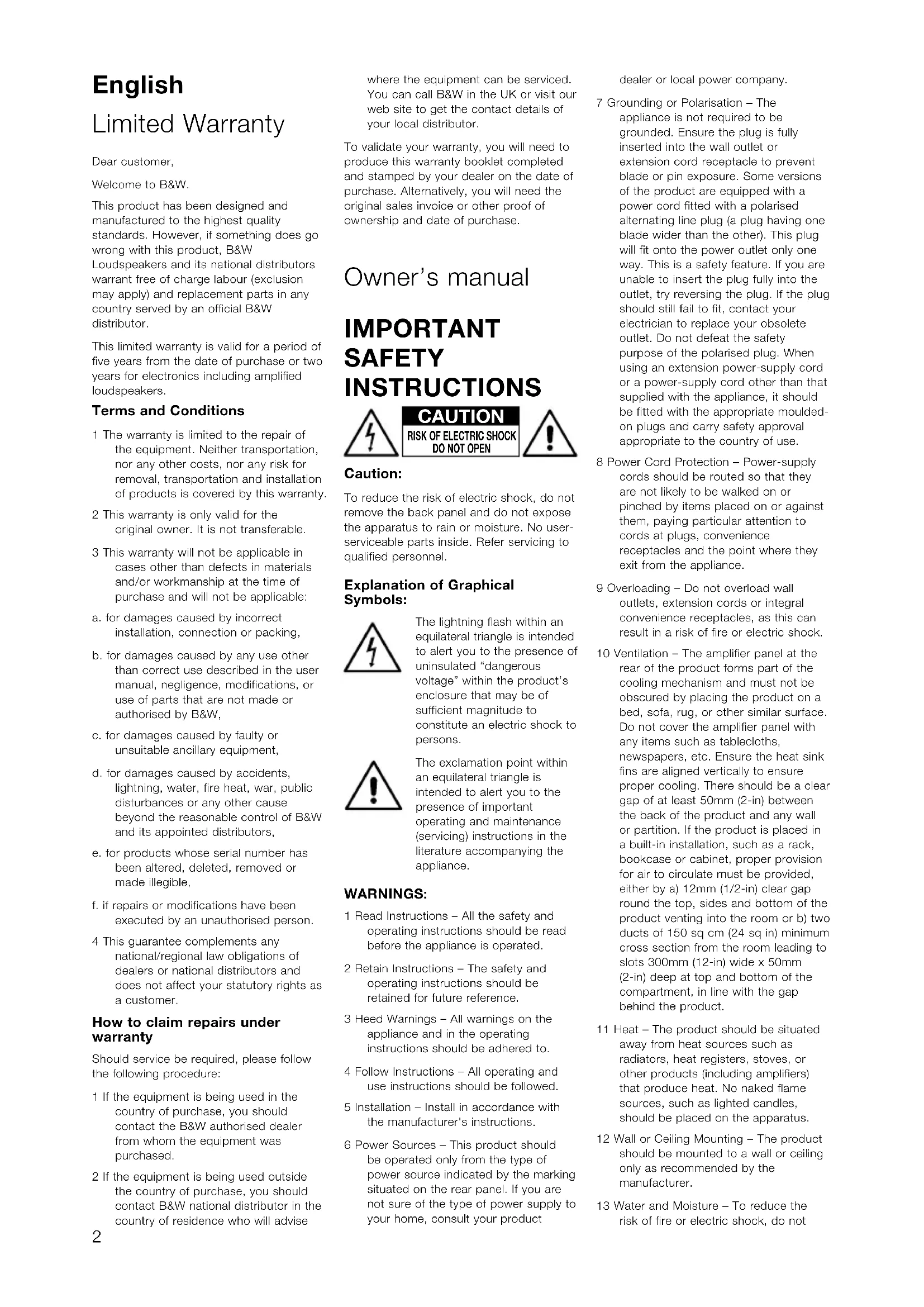 ....................52English Limited Warranty Dear customer, Welcome to B&W.This product has been designed andmanufactured to the highest qualitystandards. However, if something does gowrong with this product, B&WLoudspeakers and its national distributorswarrant free of charge labour (exclusionmay apply) and replacement parts in anycountry served by an official B&Wdistributor.This limited warranty is valid for a period offive years from the date of purchase or twoyears for electronics including amplifiedloudspeakers. Terms and Conditions 1 The warranty is limited to the repair ofthe equipment. Neither transportation,nor any other costs, nor any risk forremoval, transportation and installationof products is covered by this warranty.2 This warranty is only valid for theoriginal owner. It is not transferable.3 This warranty will not be applicable incases other than defects in materialsand/or workmanship at the time ofpurchase and will not be applicable:a. for damages caused by incorrectinstallation, connection or packing,b. for damages caused by any use otherthan correct use described in the usermanual, negligence, modifications, oruse of parts that are not made orauthorised by B&W,c. for damages caused by faulty orunsuitable ancillary equipment,d. for damages caused by accidents,lightning, water, fire heat, war, publicdisturbances or any other causebeyond the reasonable control of B&Wand its appointed distributors,e. for products whose serial number hasbeen altered, deleted, removed ormade illegible,f. if repairs or modifications have beenexecuted by an unauthorised person.4 This guarantee complements anynational/regional law obligations ofdealers or national distributors anddoes not affect your statutory rights asa customer. How to claim repairs under warranty Should service be required, please followthe following procedure:1 If the equipment is being used in thecountry of purchase, you shouldcontact the B&W authorised dealerfrom whom the equipment waspurchased.2 If the equipment is being used outsidethe country of purchase, you shouldcontact B&W national distributor in thecountry of residence who will advisewhere the equipment can be serviced.You can call B&W in the UK or visit ourweb site to get the contact details ofyour local distributor.To validate your warranty, you will need toproduce this warranty booklet completedand stamped by your dealer on the date ofpurchase. Alternatively, you will need theoriginal sales invoice or other proof ofownership and date of purchase. Owner’s manual IMPORTANT SAFETY INSTRUCTIONS Caution: To reduce the risk of electric shock, do notremove the back panel and do not exposethe apparatus to rain or moisture. No user-serviceable parts inside. Refer servicing toqualified personnel. Explanation of Graphical Symbols: The lightning flash within anequilateral triangle is intendedto alert you to the presence ofuninsulated “dangerousvoltage” within the product’senclosure that may be ofsufficient magnitude toconstitute an electric shock topersons.The exclamation point withinan equilateral triangle isintended to alert you to thepresence of importantoperating and maintenance(servicing) instructions in theliterature accompanying theappliance. WARNINGS: 1 Read Instructions – All the safety andoperating instructions should be readbefore the appliance is operated.2 Retain Instructions – The safety andoperating instructions should beretained for future reference.3 Heed Warnings – All warnings on theappliance and in the operatinginstructions should be adhered to.4 Follow Instructions – All operating anduse instructions should be followed.5 Installation – Install in accordance withthe manufacturer's instructions.6 Power Sources – This product shouldbe operated only from the type ofpower source indicated by the markingsituated on the rear panel. If you arenot sure of the type of power supply toyour home, consult your productdealer or local power company.7 Grounding or Polarisation – Theappliance is not required to begrounded. Ensure the plug is fullyinserted into the wall outlet orextension cord receptacle to preventblade or pin exposure. Some versionsof the product are equipped with apower cord fitted with a polarisedalternating line plug (a plug having oneblade wider than the other). This plugwill fit onto the power outlet only oneway. This is a safety feature. If you areunable to insert the plug fully into theoutlet, try reversing the plug. If the plugshould still fail to fit, contact yourelectrician to replace your obsoleteoutlet. Do not defeat the safetypurpose of the polarised plug. Whenusing an extension power-supply cordor a power-supply cord other than thatsupplied with the appliance, it shouldbe fitted with the appropriate moulded-on plugs and carry safety approvalappropriate to the country of use.8 Power Cord Protection – Power-supplycords should be routed so that theyare not likely to be walked on orpinched by items placed on or againstthem, paying particular attention tocords at plugs, conveniencereceptacles and the point where theyexit from the appliance.9 Overloading – Do not overload walloutlets, extension cords or integralconvenience receptacles, as this canresult in a risk of fire or electric shock.10 Ventilation – The amplifier panel at therear of the product forms part of thecooling mechanism and must not beobscured by placing the product on abed, sofa, rug, or other similar surface.Do not cover the amplifier panel withany items such as tablecloths,newspapers, etc. Ensure the heat sinkfins are aligned vertically to ensureproper cooling. There should be a cleargap of at least 50mm (2-in) betweenthe back of the product and any wallor partition. If the product is placed ina built-in installation, such as a rack,bookcase or cabinet, proper provisionfor air to circulate must be provided,either by a) 12mm (1/2-in) clear gapround the top, sides and bottom of theproduct venting into the room or b) twoducts of 150 sq cm (24 sq in) mi