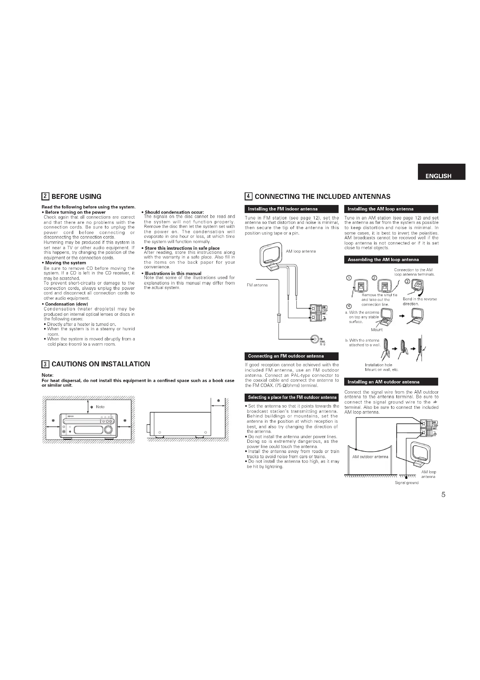 BEFORE USING Read the following before using the system.• Before turning on the powerCheck again that all connections are correctand that there are no problems with theconnection cords. Be sure to unplug thepower cord before connecting ordisconnecting the connection cords.Humming may be produced if this system isset near a TV or other audio equipment. Ifthis happens, try changing the position of theequipment or the connection cords.• Moving the systemBe sure to remove CD before moving thesystem. If a CD is left in the CD receiver, itmay be scratched.To prevent short-circuits or damage to theconnection cords, always unplug the powercord and disconnect all connection cords toother audio equipment.• Condensation (dew)Condensation (water droplets) may beproduced on internal optical lenses or discs inthe following cases:• Directly after a heater is turned on.• When the system is in a steamy or humidroom.• When the system is moved abruptly from acold place (room) to a warm room.• Should condensation occur:The signals on the disc cannot be read andthe system will not function properly.Remove the disc then let the system set withthe power on. The condensation willevaporate in one hour or less, at which timethe system will function normally.• Store this instructions in safe placeAfter reading, store this instructions alongwith the warranty in a safe place. Also fill inthe items on the back paper for yourconvenience.• Illustrations in this manualNote that some of the illustrations used forexplanations in this manual may differ fromthe actual system.