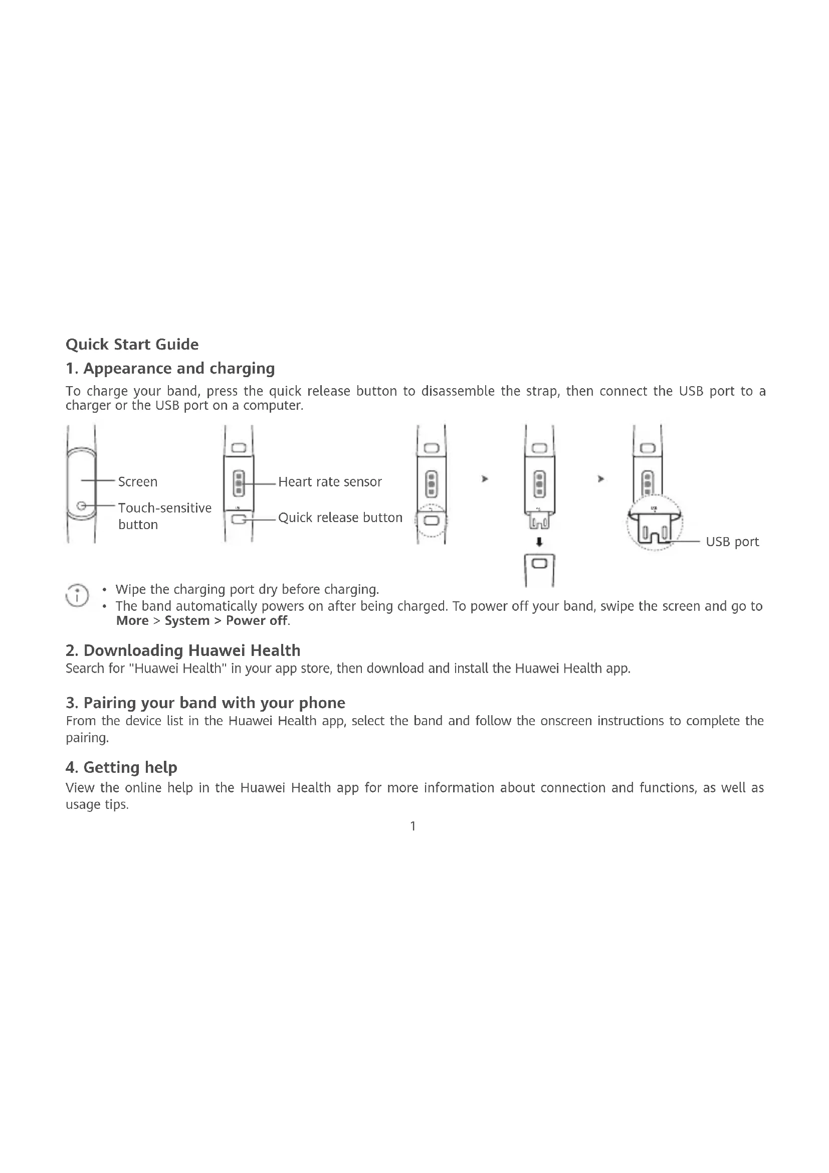 View the online help in the Huawei Health app for more information about connection and functions, as well as usage tips. Heart rate sensor Touch-sensitive button Screen USB port USB USB Quick release button USB USB USB USB2 3 Copyright © Huawei Technologies Co., Ltd. 2019. All rights reserved. THIS DOCUMENT IS FOR INFORMATION PURPOSE ONLY, AND DOES NOT CONSTITUTE ANY KIND OF WARRANTIES. Trademarks and Permissions