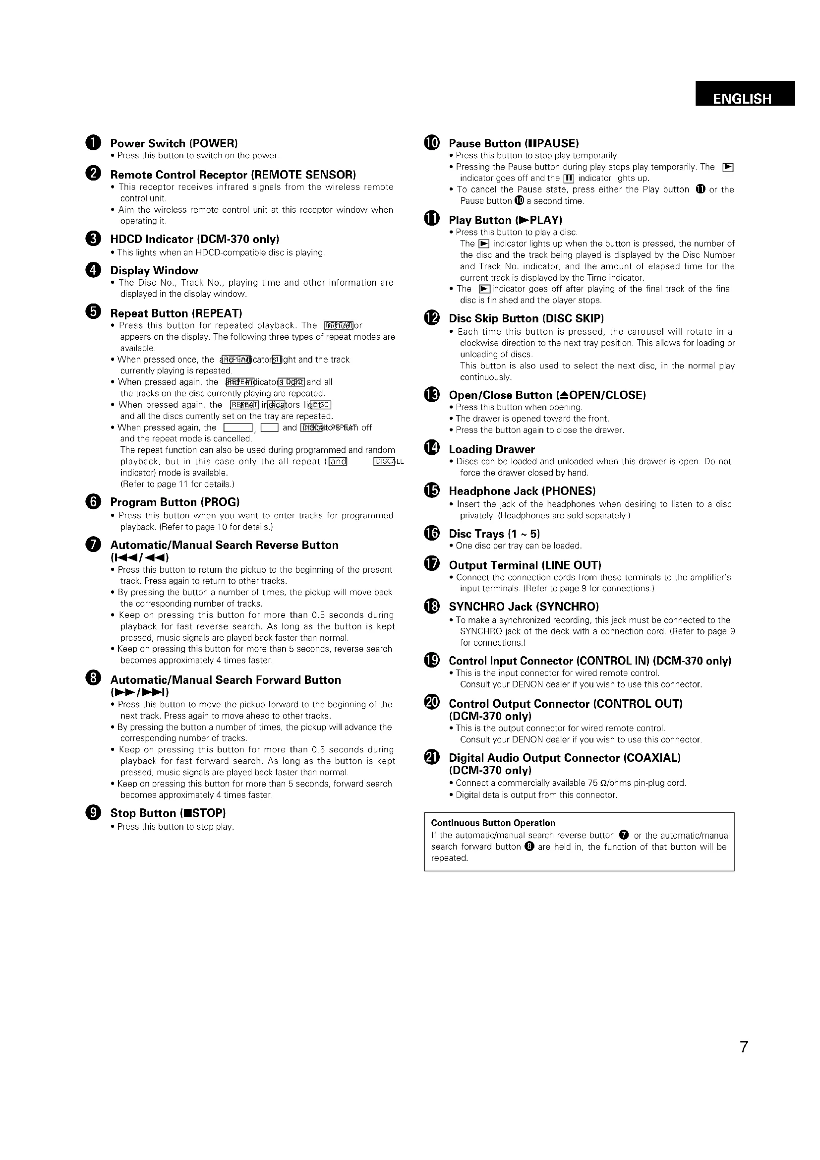 - Release the Automatic/Manual search button ( 8/6 or 7/9) when the desired point has been reached. Normal playback then continues. (1) Manual Search Forward OPEN/CLOSEDISC SKIP5 DISC AUTOMATIC DISC LOADING SYSTEM STOP PAUSE PLAY PROG PHONESREPEATDCM-370PCM AUDIO TECHNOLOGY / CD AUTO CHANGER REMOTE SENSOR HDCD £¢ ON OFF TRACK