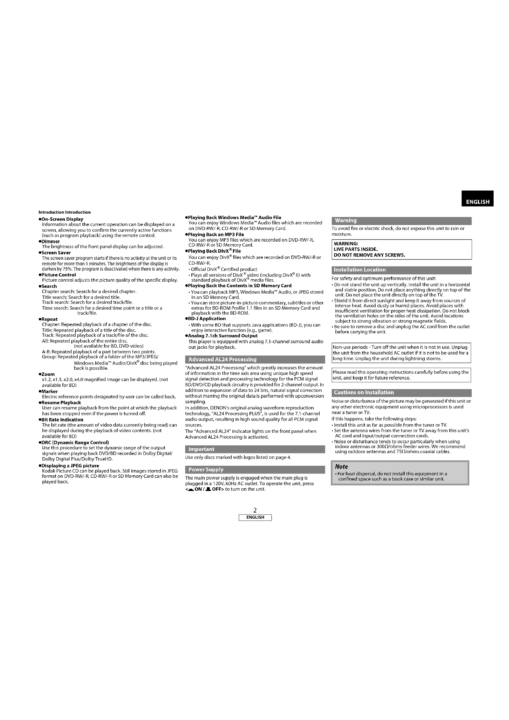 - With some BD that supports Java applications (BD-J), you can enjoy interactive function (e.g., game). ●Analog 7.1ch Surround Output This player is equipped with analog 7.1-channel surround audio out jacks for playback. “Advanced AL24 Processing” which greatly increases the amount of information in the time axis area using unique high speed signal detection and processing technology for the PCM signal BD/DVD/CD playback circuitry is provided for 2-channel output. In addition to expansion of data to 24 bits, natural signal correction without marring the original data is performed with upconversion sampling. In addition, DENON’s original analog waveform reproduction technology, “AL24 Processing PLUS”, is used for the 7.1-channel audio output, resulting in high sound quality for all PCM signal sources. The “Advanced AL24” indicator lights on the front panel when Advanced AL24 Processing is activated. Use only discs marked with logos listed on page 4. The main power supply is engaged when the main plug is plugged in a 120V, 60Hz AC outlet. To operate the unit, press <B ON / A OFF> to turn on the unit. To avoid fire or electric shock, do not expose this unit to rain or moisture. For safety and optimum performance of this unit: