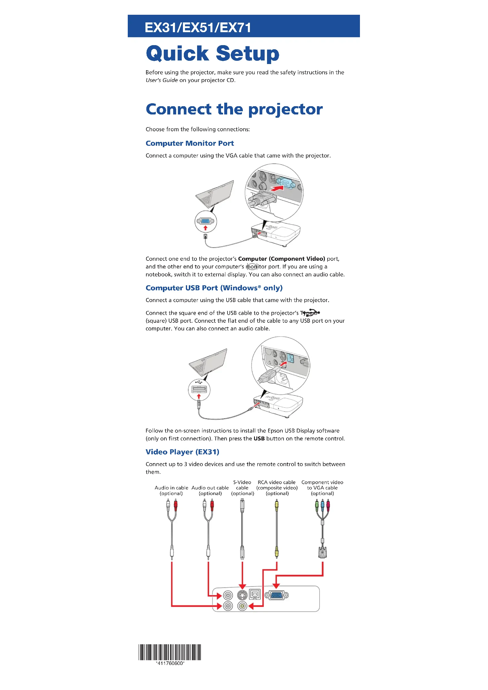 If your image looks like or , press the or buttons on the projector to correct it. Using the remote control Make sure the batteries are installed as shown (two included AA batteries).Change presentation slides (USB connection only)Access projector menusChoose which source to displayControl projector volumeTurn projector on and offTurn off projector display and soundGet solutions to common problemsNavigate projector menusYou can use the remote control to operate the projector. With the USB cable, you can use the remote as a wireless mouse. For more information on using the remote control, see your User’s Guide. Where to get help Manual For more information about using the projector, install the User’s Guide from your projector CD. Telephone Support Services To use the Epson PrivateLine Support service, call (800) 637-7661 and enter the PIN on the Epson PrivateLine Support card included with your projector. This service is available 6 AM to 6 PM, Pacific Time, Monday through Friday, for the duration of your warranty period. You may also speak with a projector support specialist by dialing one of these numbers: U.S.: (562) 276-4394, 6 AM to 6 PM, Pacific Time, Monday through Friday Canada: (905) 709-3839, 6 AM to 6 PM, Pacific Time, Monday through Friday Days and hours of support are subject to change without notice. Toll or long distance charges may apply. Internet Support Visit Epson’s support website at epson.com/support and select your product for solutions to common problems. You can download utilities and documentation, get FAQs and troubleshooting advice, or e-mail Epson with your questions. Registration Register today to get product updates, special promotions, and customer-only offers. You can use the CD included with your projector, or register online at www.epson.com/webreg. EX31/EX51/EX71 *411760600* *411760600* Epson is a registered trademark and Epson Exceed Your Vision is a registered logomark of Seiko Epson Corporation. PrivateLine is a registered trademark of Epson America, Inc. General Notice: Other product names used herein are for identification purposes only and may be trademarks of their respective owners. Epson disclaims any and all rights in those marks. This information is subject to change without notice. © 2009 Epson America, Inc. 7/09 Printed in XXXXXX CPD-27597Quick Setup Before using the projector, make sure you read the safety instructions in the User’s Guide on your projector CD. Connect the projector Choose from the following connections: Computer Monitor Port Connect a computer using the VGA cable that came with the projector. Connect one end to the projector’s Computer (Component Video) port, and the other end to your computer’s monitor port. If you are using a notebook, switch it to external display. You can also connect an audio cable. Computer USB Port (Windows only) Connect a computer using the USB cable that came with the projector. Connect the square end of the USB cable to the projector’s Type B (square) USB port. Connect the flat end of the cable to any USB port on your computer. You can also connect an audio cable. Follow the on-screen instructions to install the Epson USB Display software (only on first connection). Then press the USB button on the remote control. Video Player (EX31) Connect up to 3 video devices and use the remote control to switch between them.RCA video cable (composite video)(optional)S-Video cable(optional)Component video to VGA cable(optional) Audio out cable (optional)Audio in cable (optional) Video Player (EX51/EX71) Connect up to 4 video devices and use the remote control to switch between them.RCA video cable (composite video)(optional)S-Video cable(optional)Component video to VGA cable(optional)Audio cable (optional)HDMI video cable(optional) Camera or USB Device (EX51/EX71) Connect a digital camera or other USB device to the projector’s Type A (flat) USB port.Digital cameraThumb drive You can use the projector’s Slideshow feature to project JPEG images. See the User’s Guide on your projector CD. Turn on your equipment