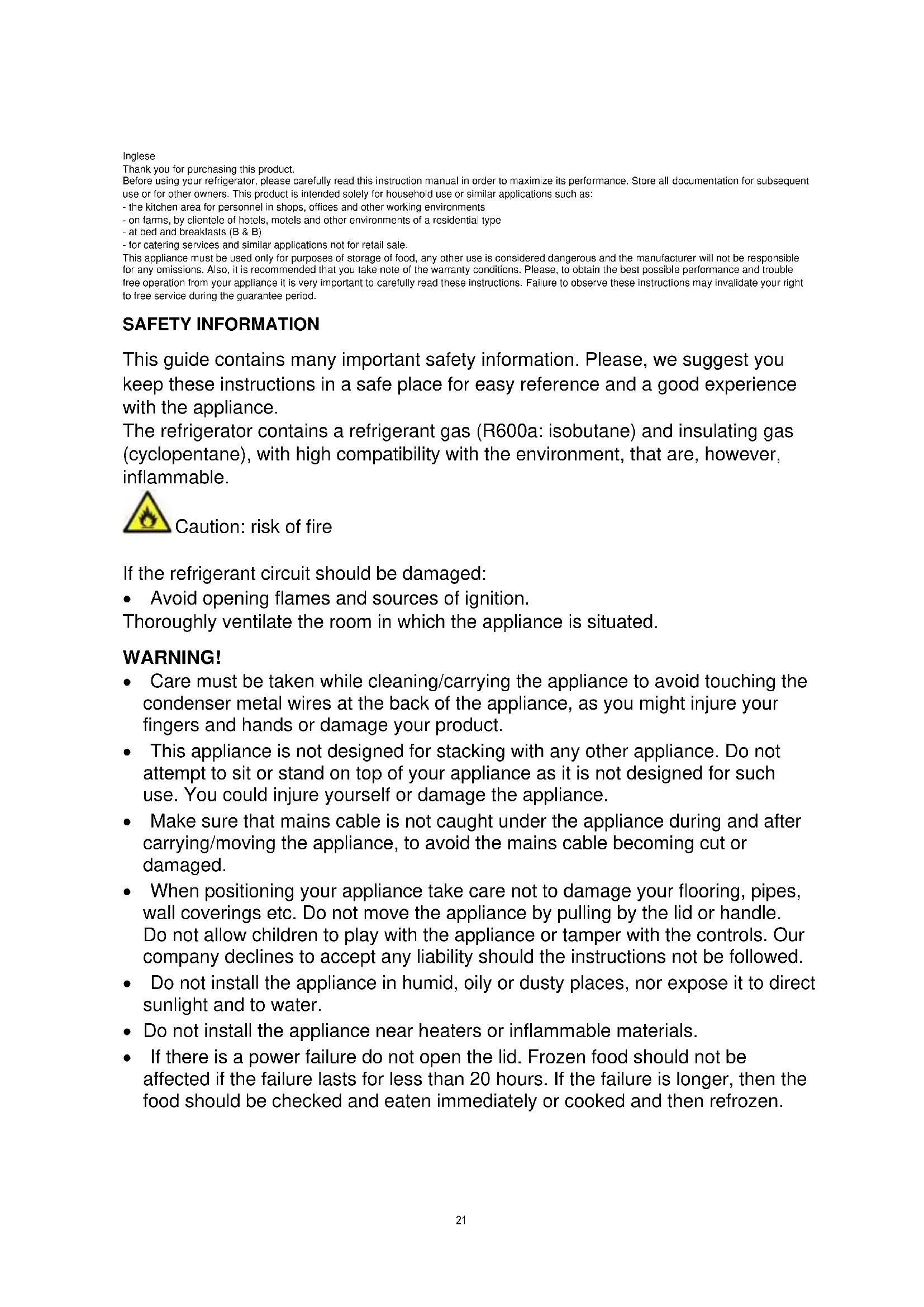 - Do not dispose of the appliance on a fire. Take care not to damage, the cooling circuit/pipes of the appliance in transportation and in use. In case of damage do not expose the appliance to fire, potential ignition source and immediately ventilate the room where the appliance is situated.